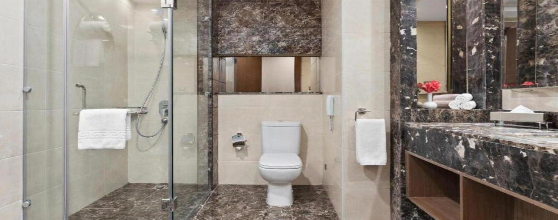 - баня с душ или вана, сешоар и козметика