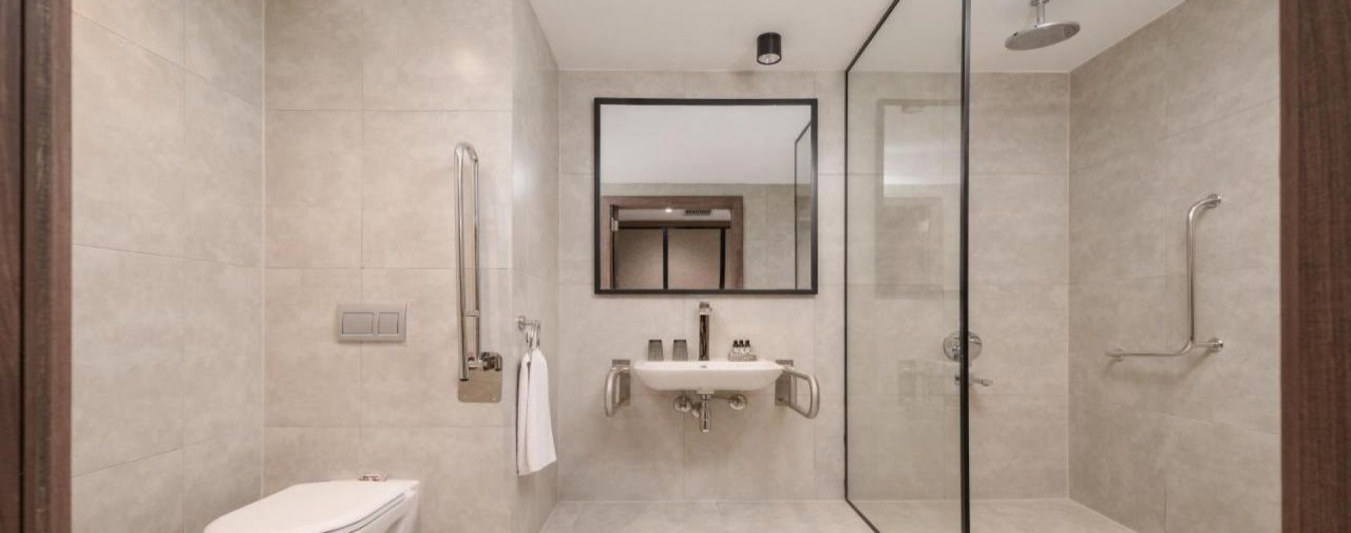 - Голям самостоятелен душ тип тропически дъжд и тоалетна