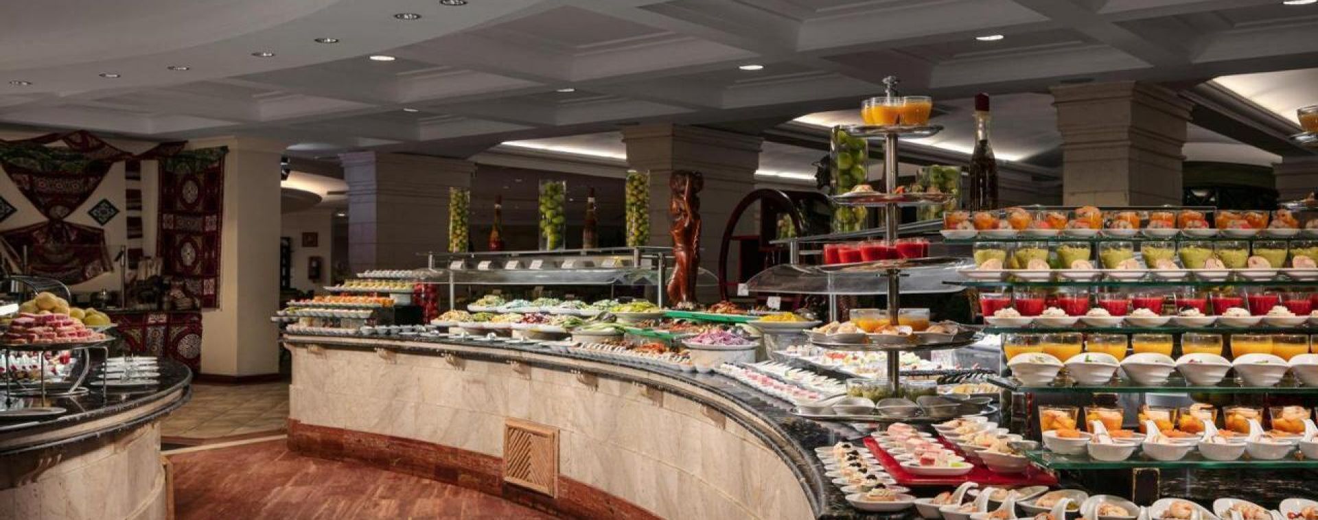 Основният ресторант предлага закуска, обяд и вечеря на блок маса с интернационална кухня. Хотелът разполага и с няколко а ла карт ресторанта – гръцки, италиански, азиатски и ориенталски. Предварителна резервация е необходима за а ла карт ресторантите. Баровете в комплекса предлагат богато разнообразие от напитки и леки закуски през деня.