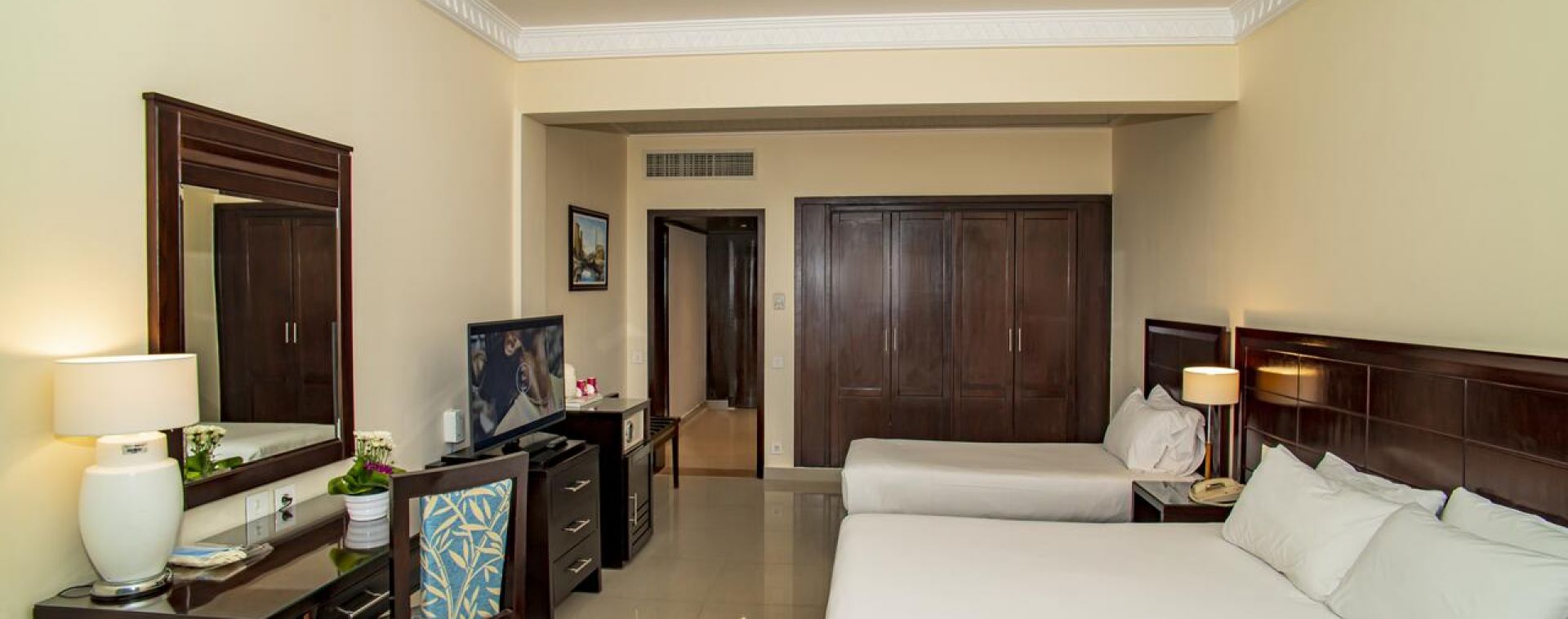 Всички стаи са оборудвани с климатик, телевизор, телефон, баня с вана/душ, Wi- Fi (срещу заплащане), сешоар, минибар (платен), бюро, сейф, балкон. Почистване на стаите– всеки ден.