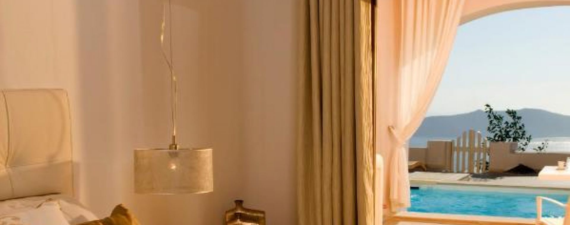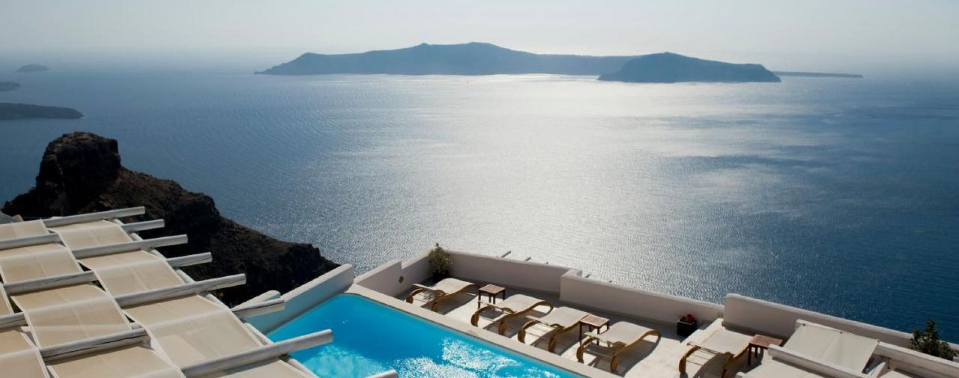 Климатик, телевизор, телефон, сейф в стаята, сешоар, халати и чехли, тоалетни принадлежности Apivita (гръцка натурална козметика), Мини бар Nespresso безплатно кафе, Безплатен WI-Fi 2, собствена веранда с гледка към калдерата и външен отопляем басейн, рум сервиз. Размер 50 кв. м.