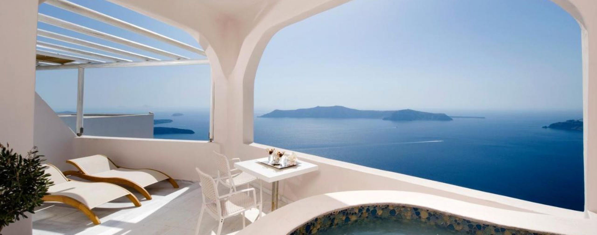 Климатик, телевизор, телефон, сейф в стаята, сешоар, халати и чехли, тоалетни принадлежности Apivita (гръцка натурална козметика), Мини бар Nespresso безплатно кафе, Безплатен WI-Fi, собствена веранда с гледка към калдерата и външно отопляемо джакузи, рум сервиз. Размер 45 кв. м.
