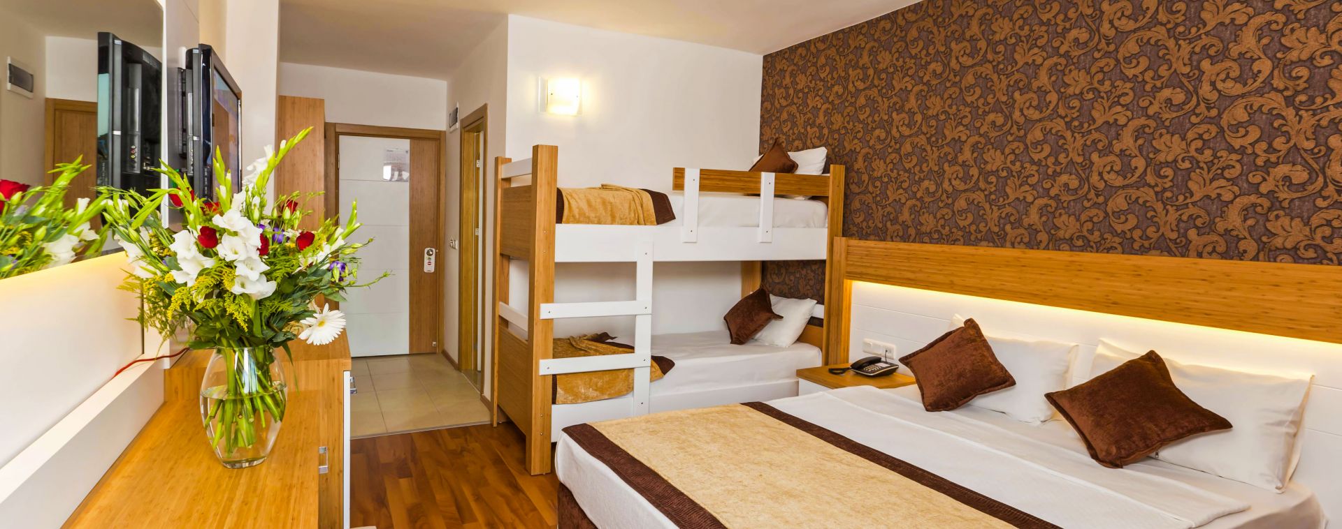 BUNK BED ROOM B- Разполагат с 1 спалня + 1 голямо еденично легло + 1 двуетажно легло. Всяка стая разполага с баня и тоалетна. Общата площ на стаята: 15м2. Максимум капацитет за настаняване- 3 възрастни или двама възрастни с две деца или трима възрастни с едно дете.