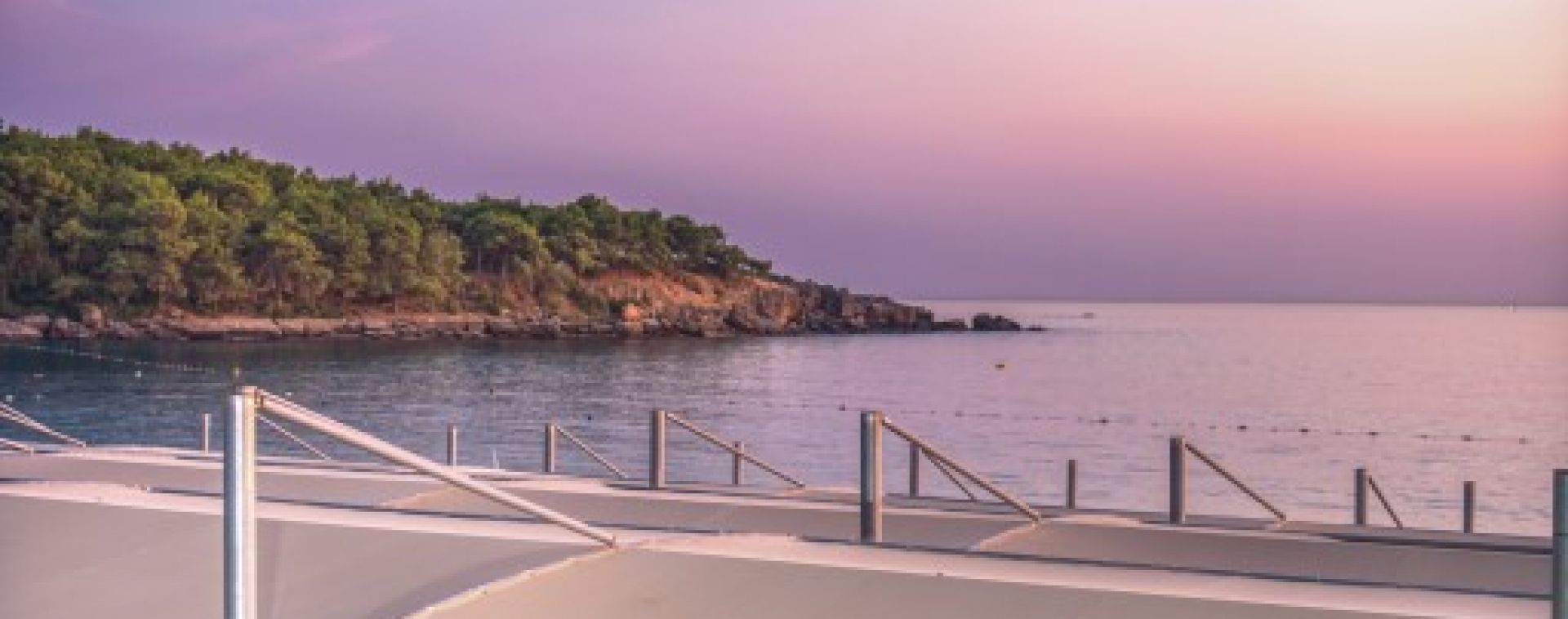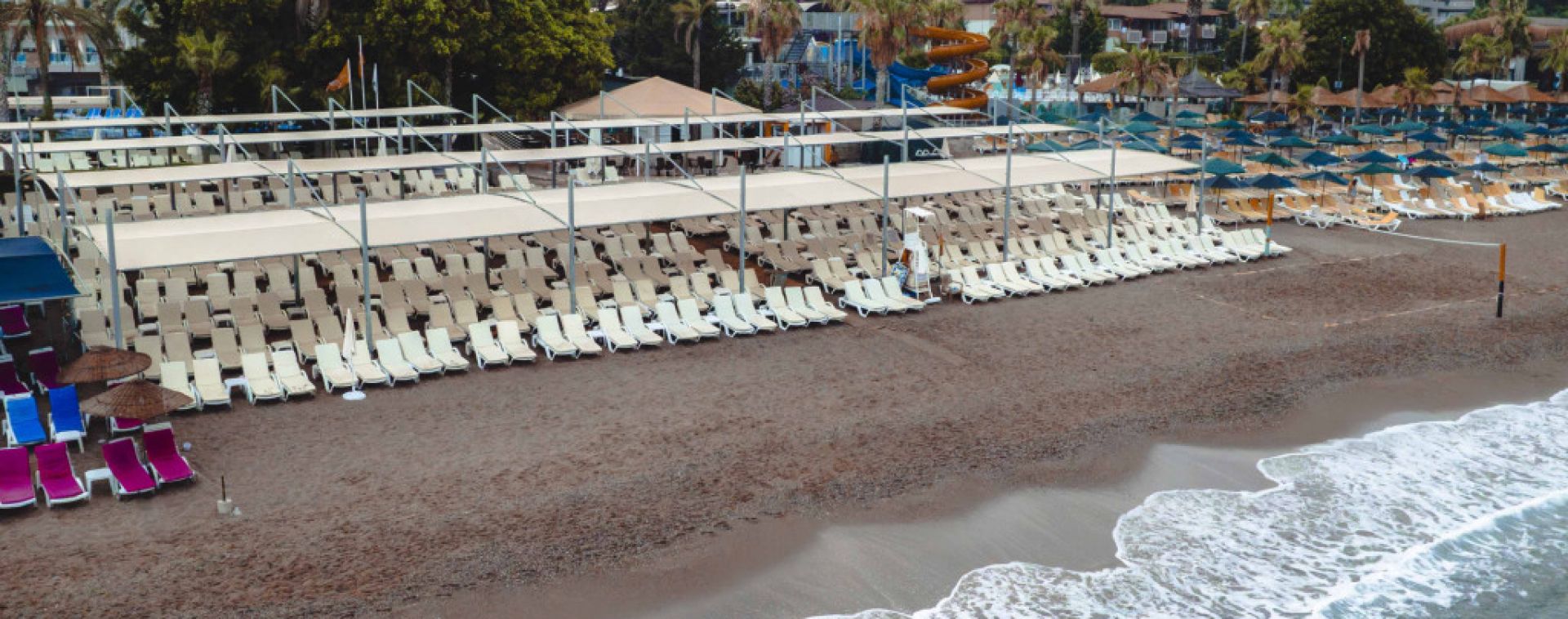 Собствен, пясъчно-чакълест, с дължина на плажната ивица 40м. Чадъри, шезлонги и плажни кърпи на плажа и при басейна – безплатно.