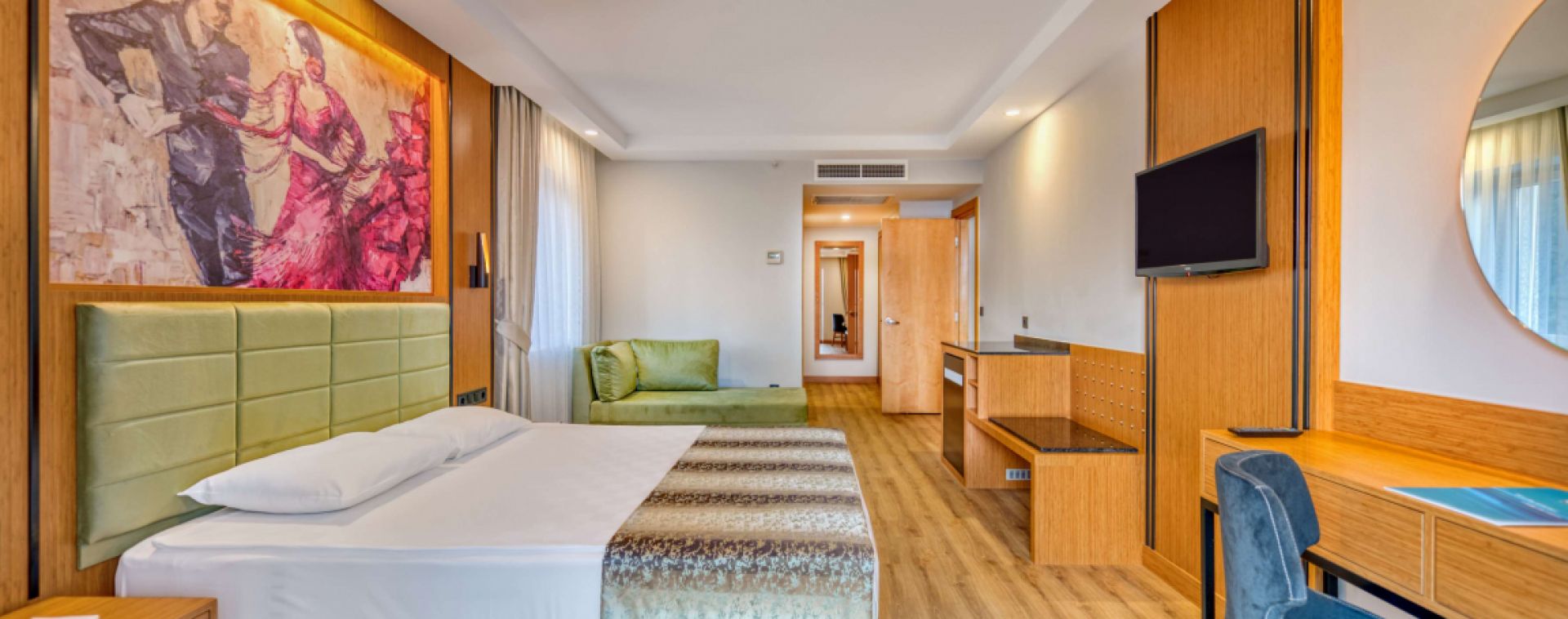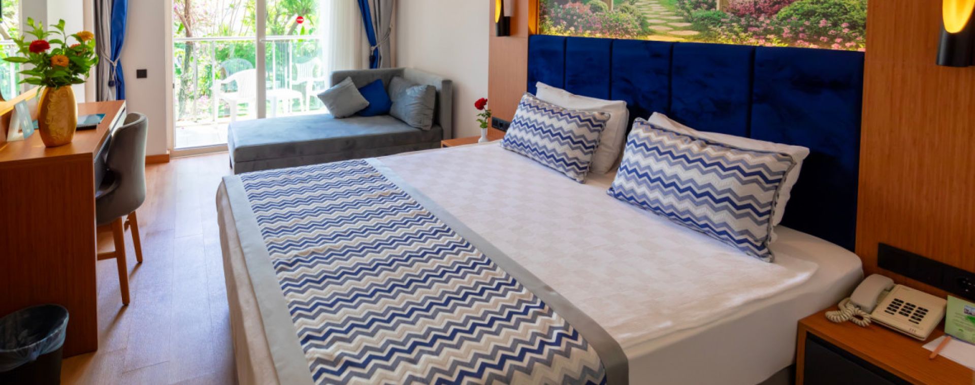 Хотелът разполага с общо 328 стаи, от които 239 стандартни стаи Standard Room Garden View (изглед градина – 20 м2), Standard Room Side Sea View (изглед частично море – 20 м2), 70 Large Room (изглед градина или страничен изглед море – 24 м2), 6 Duplex Family Room (2 спални, баня, изглед градина, 36-40 м2), 3 Family Sea View (2 спални, баня, изглед частично море, 36-40 м2).