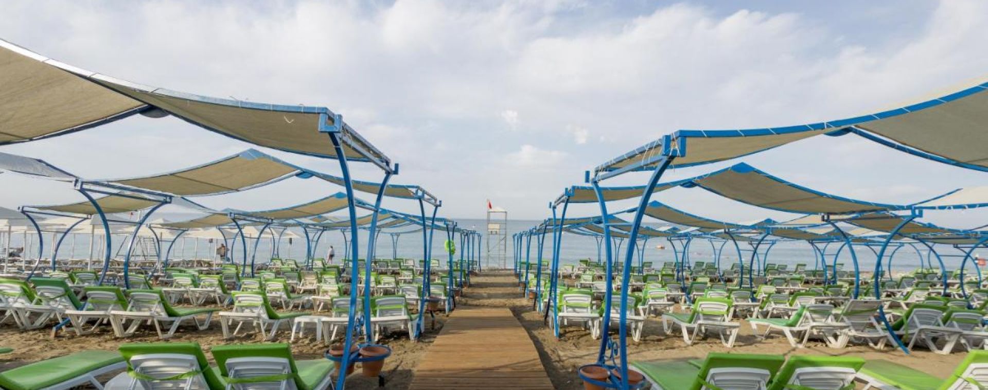 Собствен, на 400 м. от хотела, пясъчно-чакълест през подлез. Безплатен шатъл до плажа (по разписание). Чадъри и шезлонги на плажа и при басейна - безплатно. Плажни кърпи – срещу депозит.