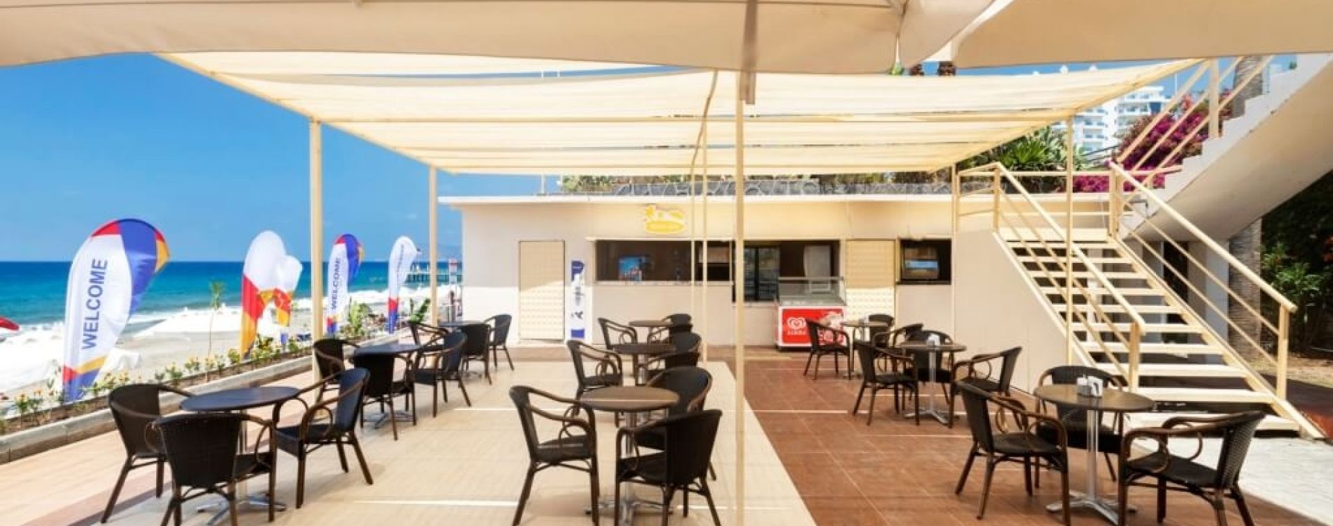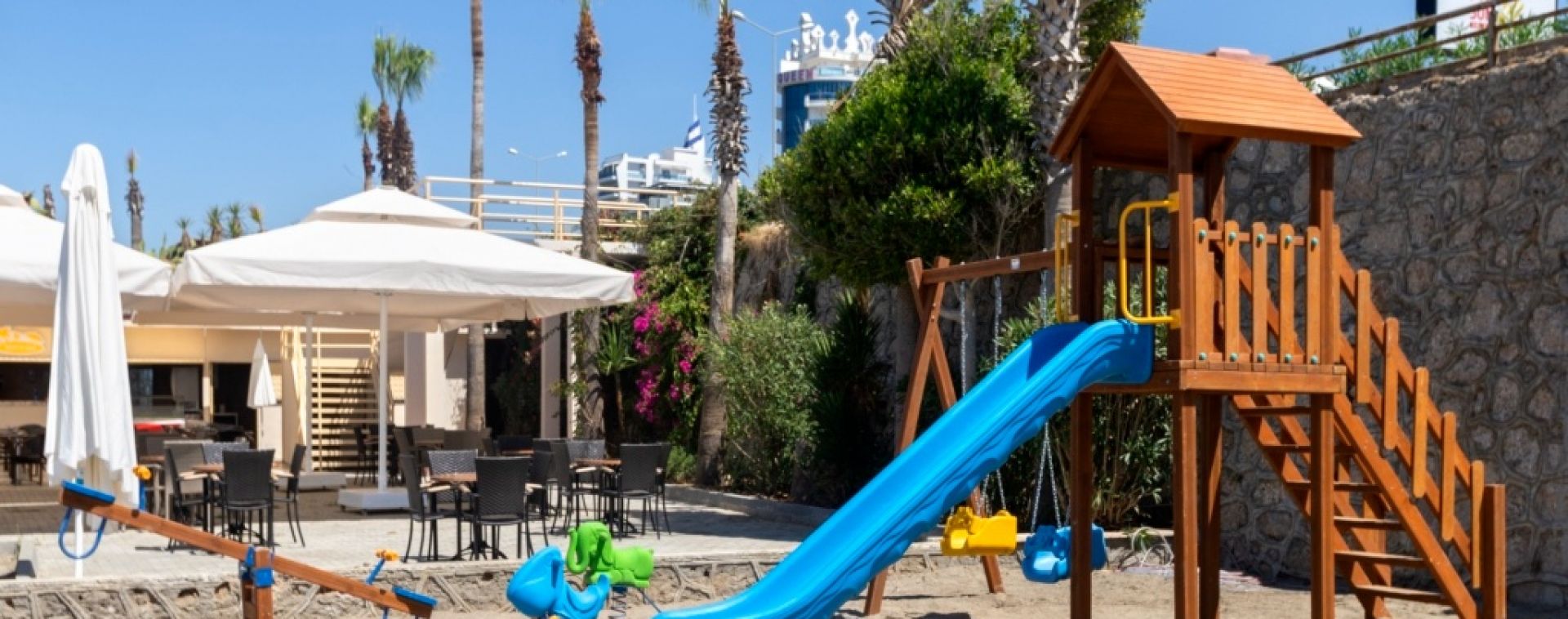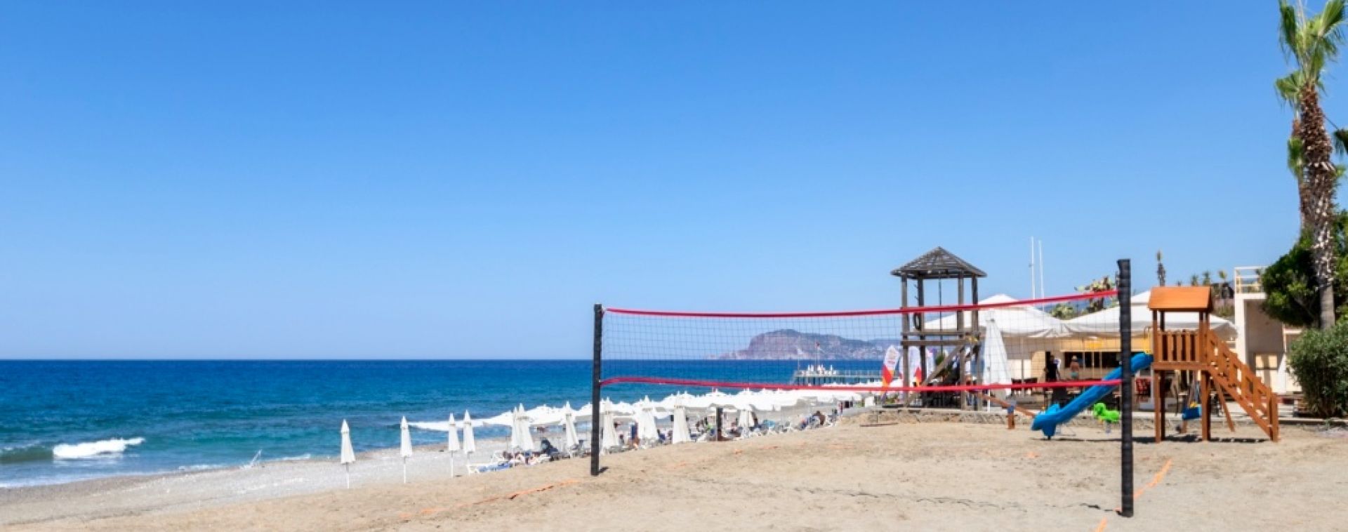 Собствен, пясъчно-чакълест с дължина 150 м. (до плажа се стига през подлез). Чадъри и шезлонги на плажа и при басейна – безплатно. Плажни кърпи – безплатно.