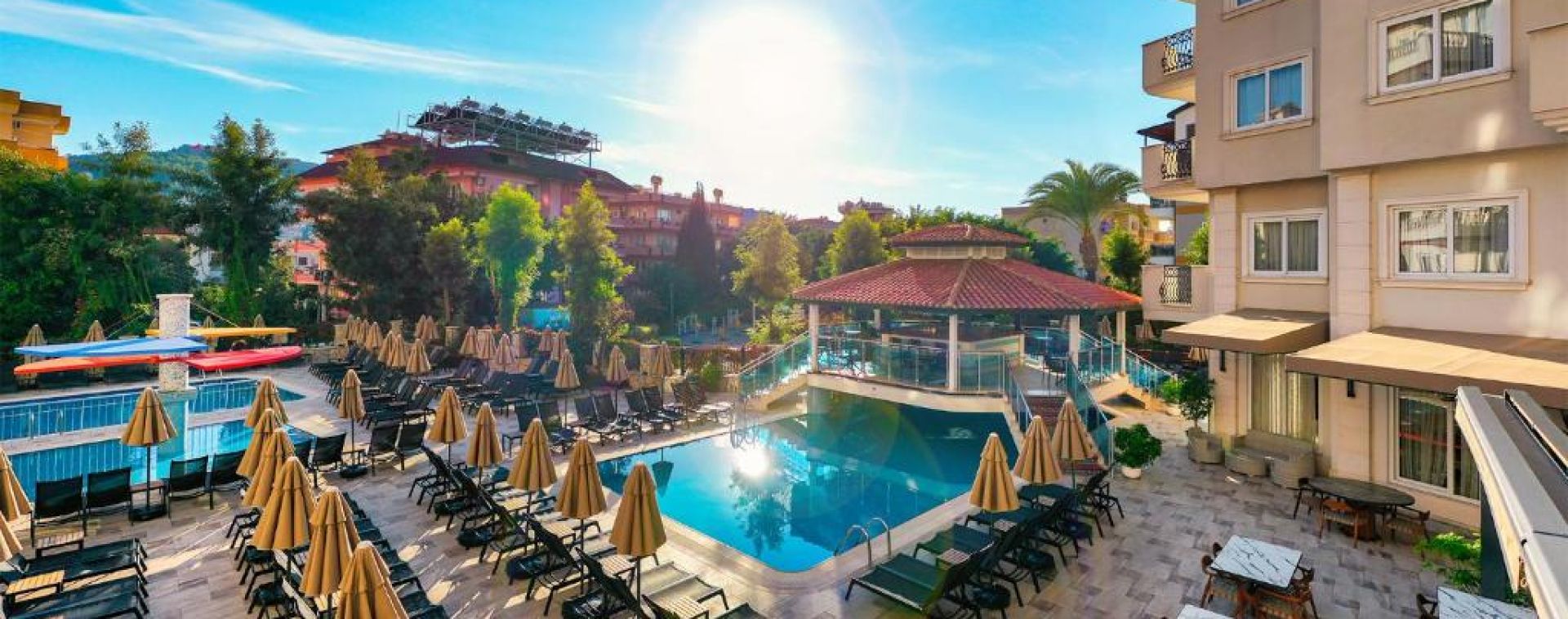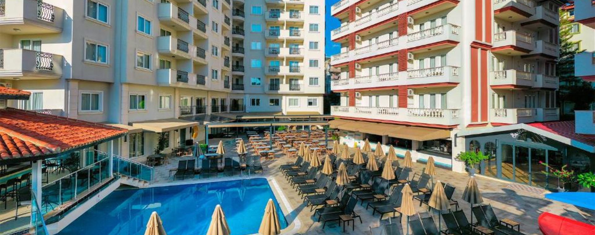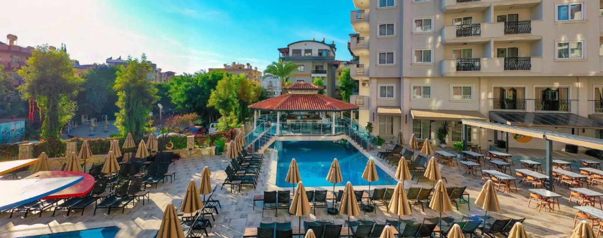 Намира се на 130 км от летище Анталия, на 500 м от центъра на Алания, на 2 км от брега на морето и известния плаж Kleopatra Beach. Построен 1995 г., на обща площ от 8 000 м2. Частично реновиран 2026 г.