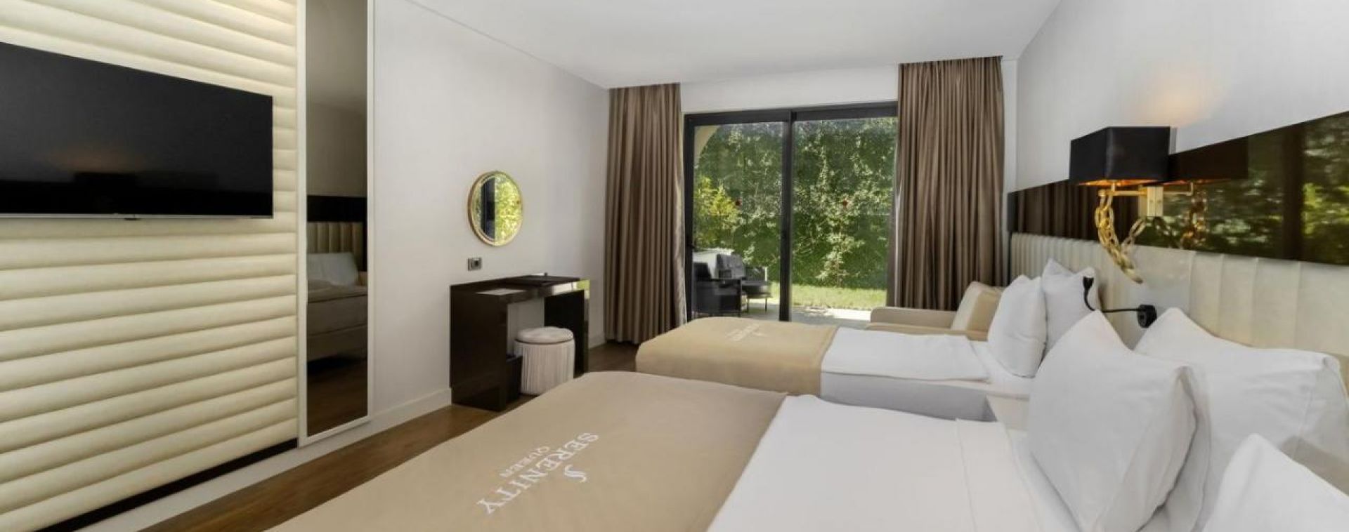 От които 5 Promo room (без балкон – 22 м2), 30 Deluxe sea view (изглед море 26 - 30 м2), 160 Deluxe room, 16 Garden room with Terrace - с тераси, 20 Junior Suite Room (хол + спалня 32 – 34 м2).
