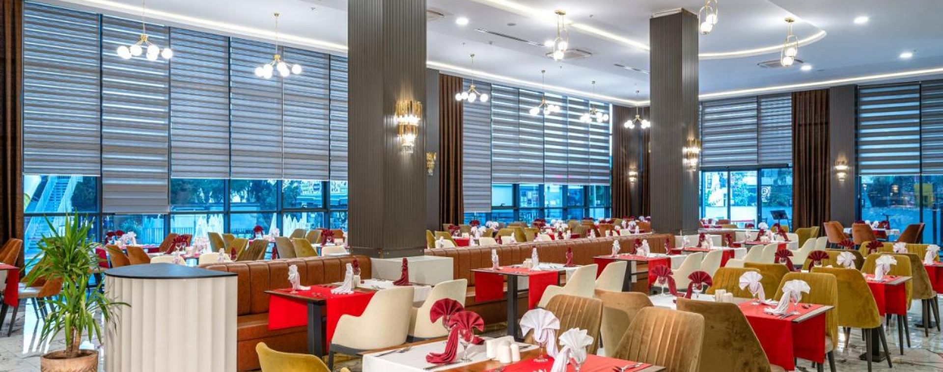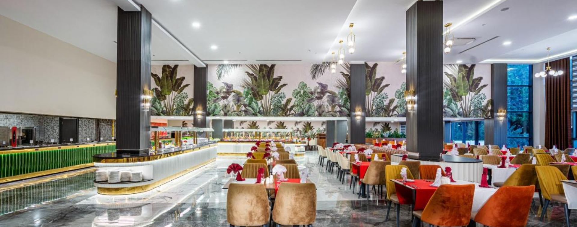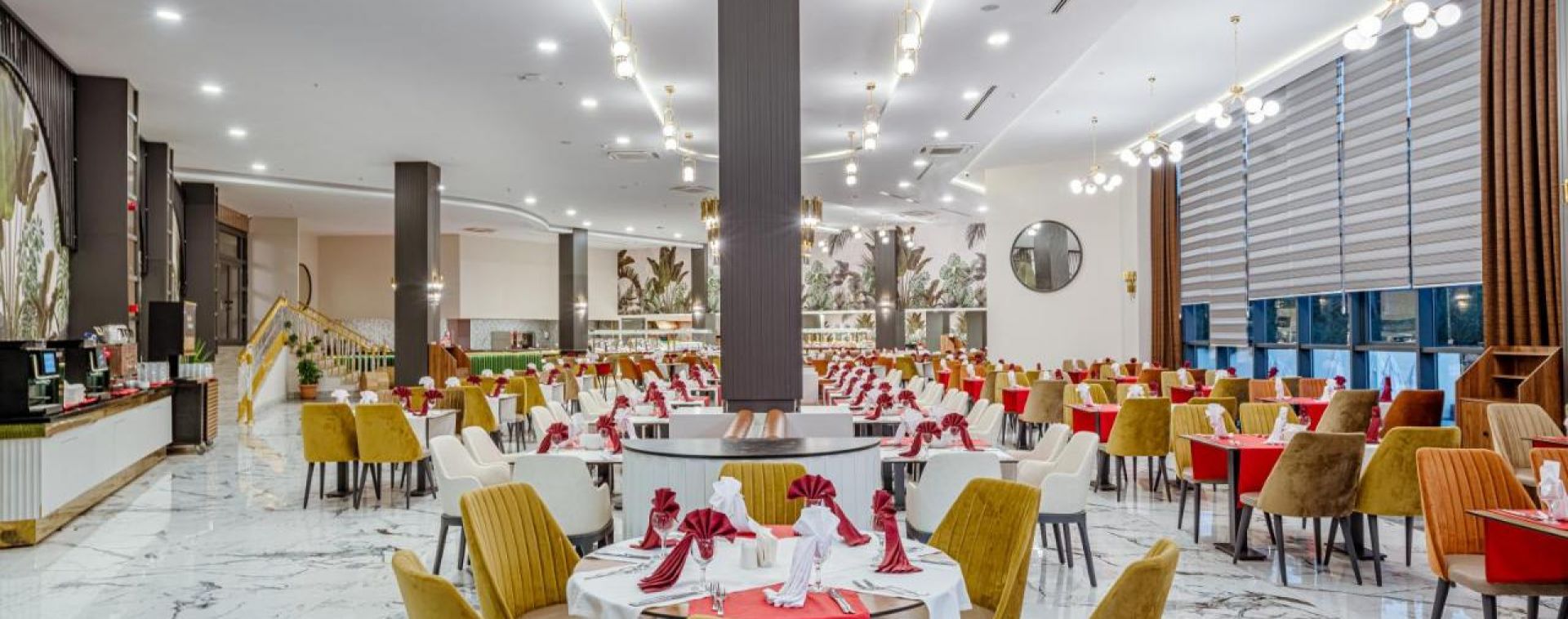 Основен ресторант, а-ла-карт ресторант – интернационален (1 безплатно посещение минимум 7 нощувки), сладкарница, 3 бара, открит и закрит басейн, водни пързалки, СПА център.
