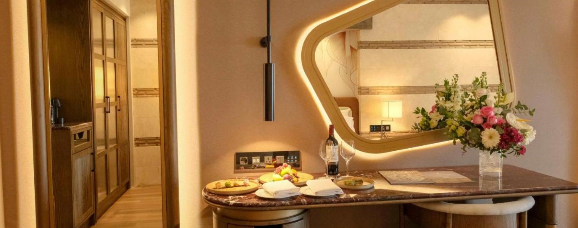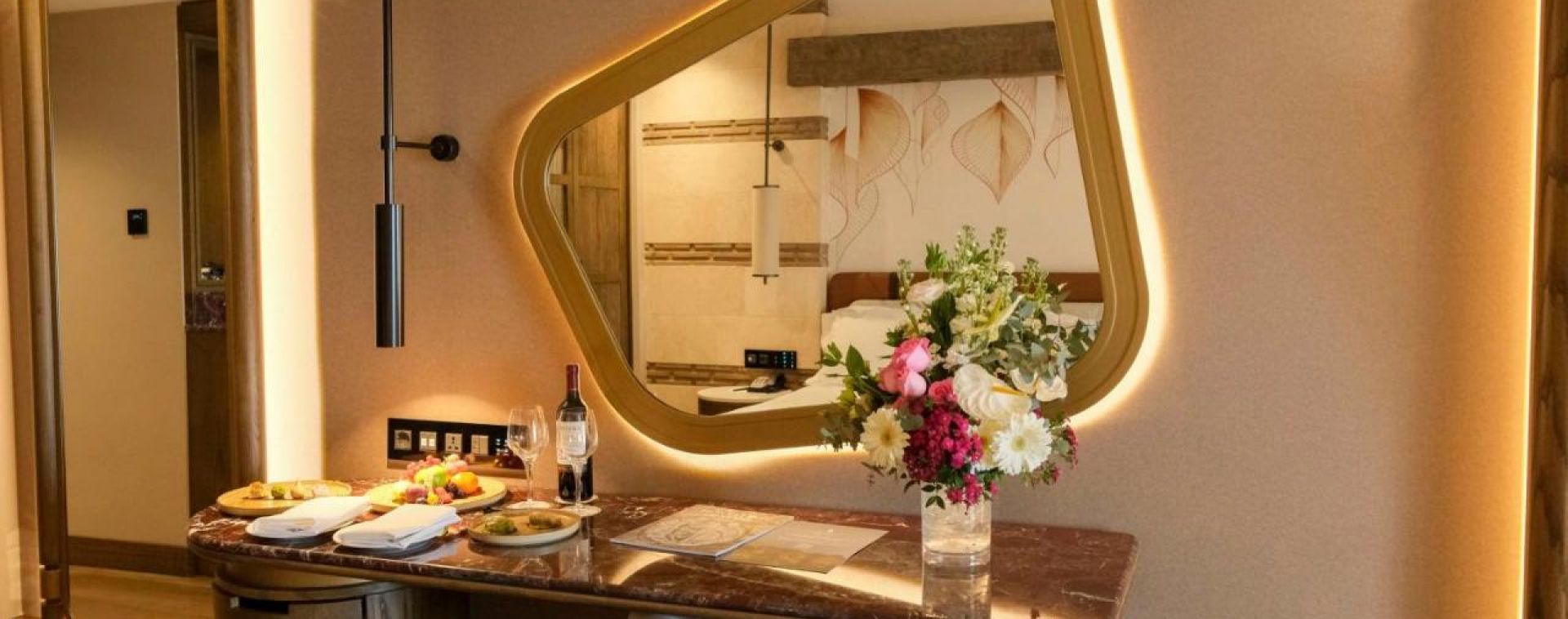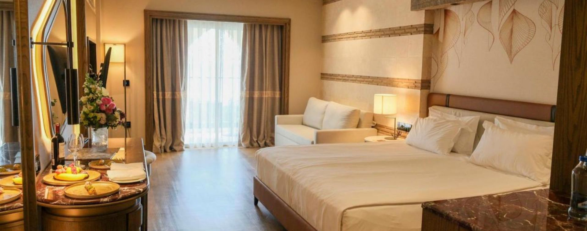 вана и душ,сешоар,везна,халат,чехли,централен климатик (Main building, регулира се от гостите на хотела),индивидуален климатик (villas,плазмен телевизор (може да се използва и като монитор за компютър – срещу допълнително заплащане),телефон,мини-бар (платено), сейф (в стаята, безплатно),под – паркет,балкон или тераса,почистване на стаите – ежедневно,смяна на спално бельо (по желание на гостите, ежедневно),room service (24 часа, платено),интернет (безжичен, кабелен, безплатно).
