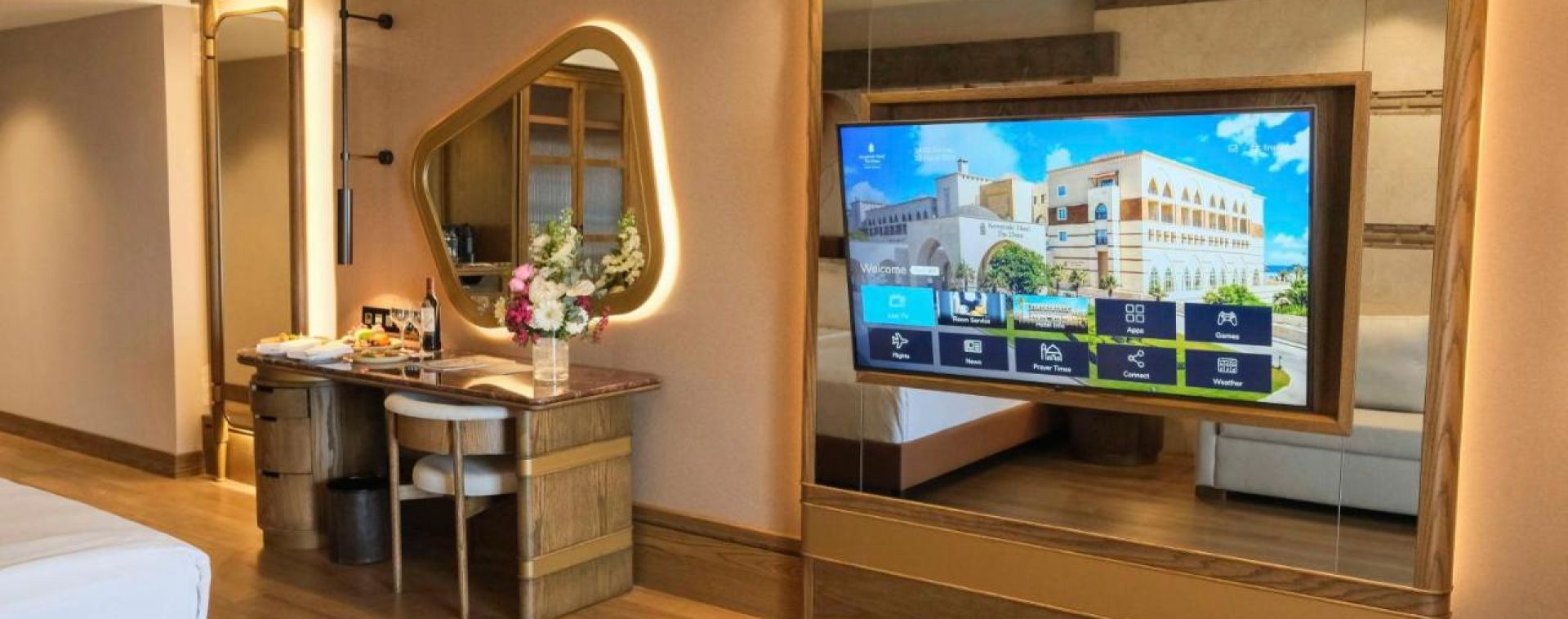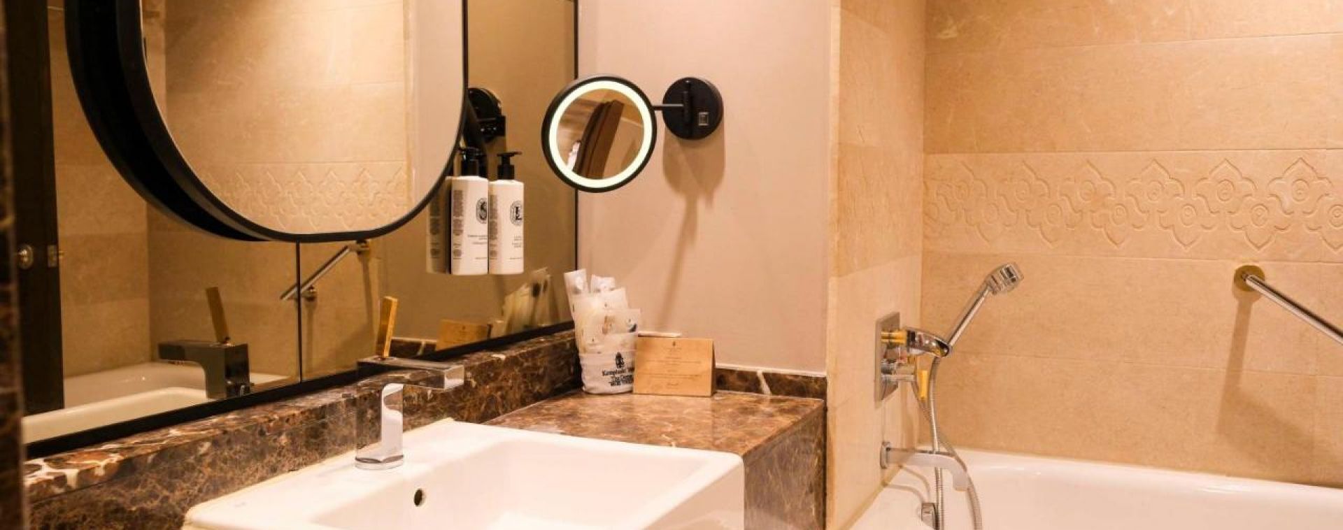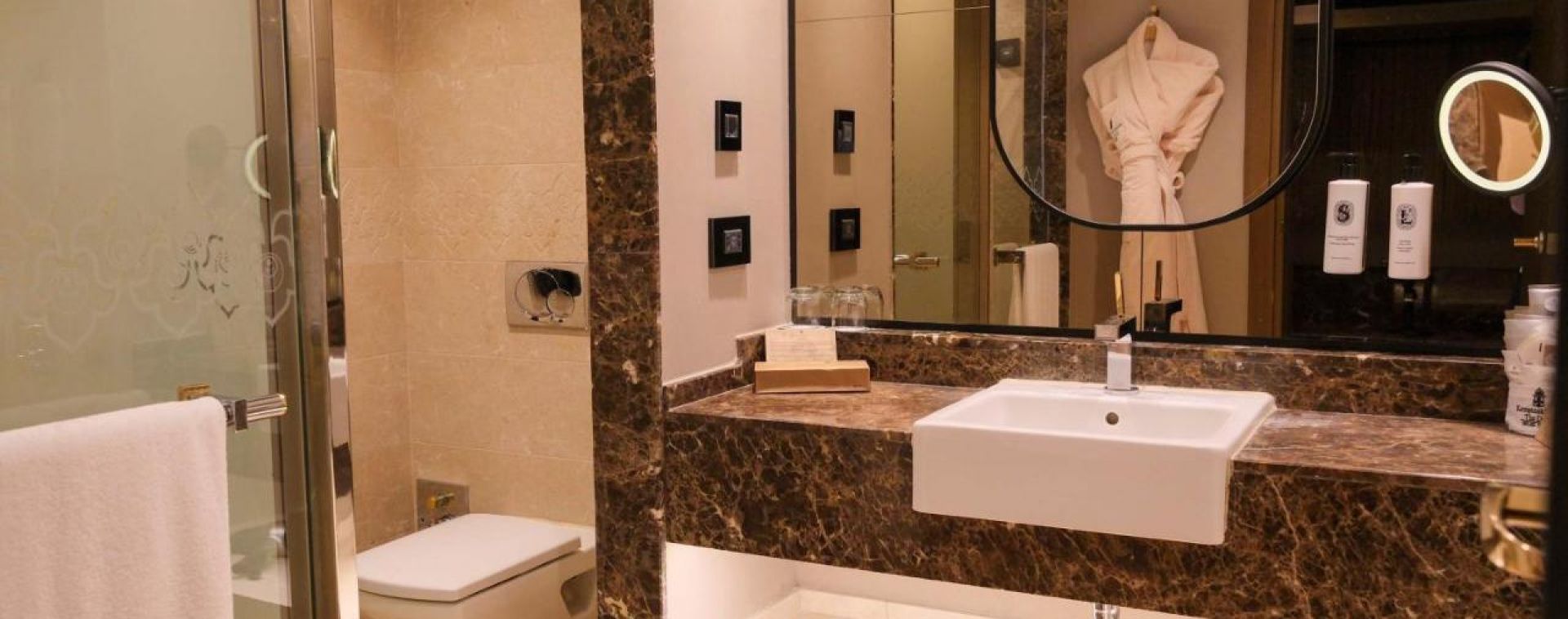 вана и душ,сешоар,везна,халат,чехли,централен климатик (Main building, регулира се от гостите на хотела),индивидуален климатик (villas,плазмен телевизор (може да се използва и като монитор за компютър – срещу допълнително заплащане),телефон,мини-бар (платено), сейф (в стаята, безплатно),под – паркет,балкон или тераса,почистване на стаите – ежедневно,смяна на спално бельо (по желание на гостите, ежедневно),room service (24 часа, платено),интернет (безжичен, кабелен, безплатно).