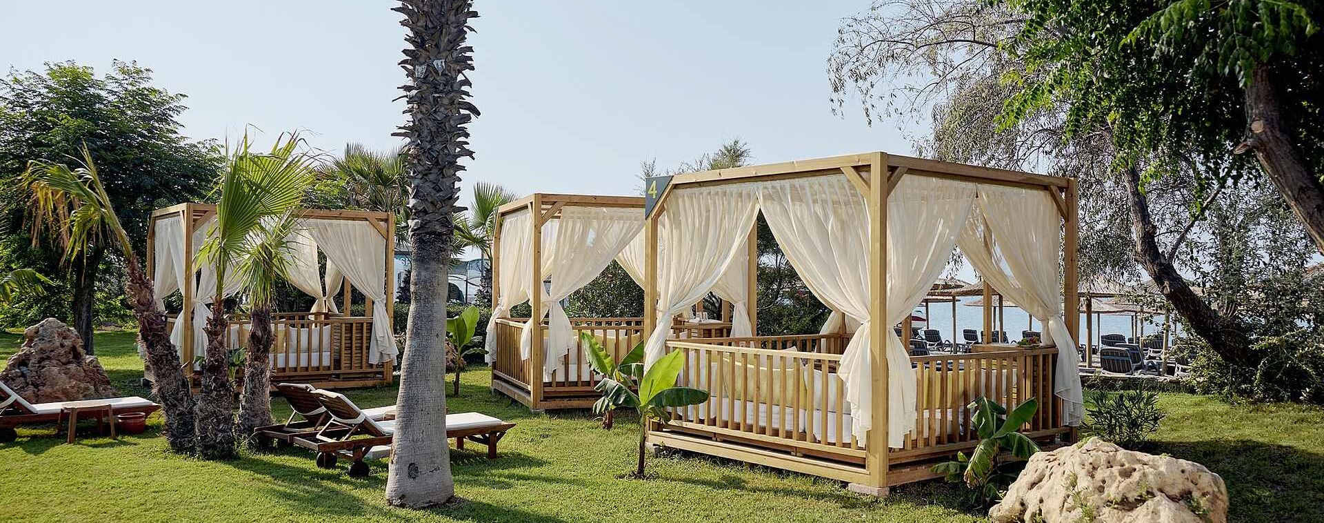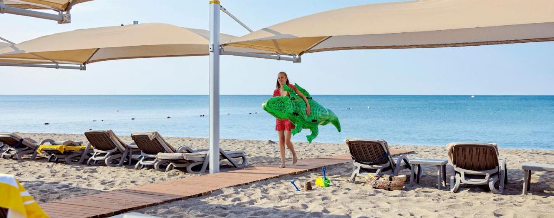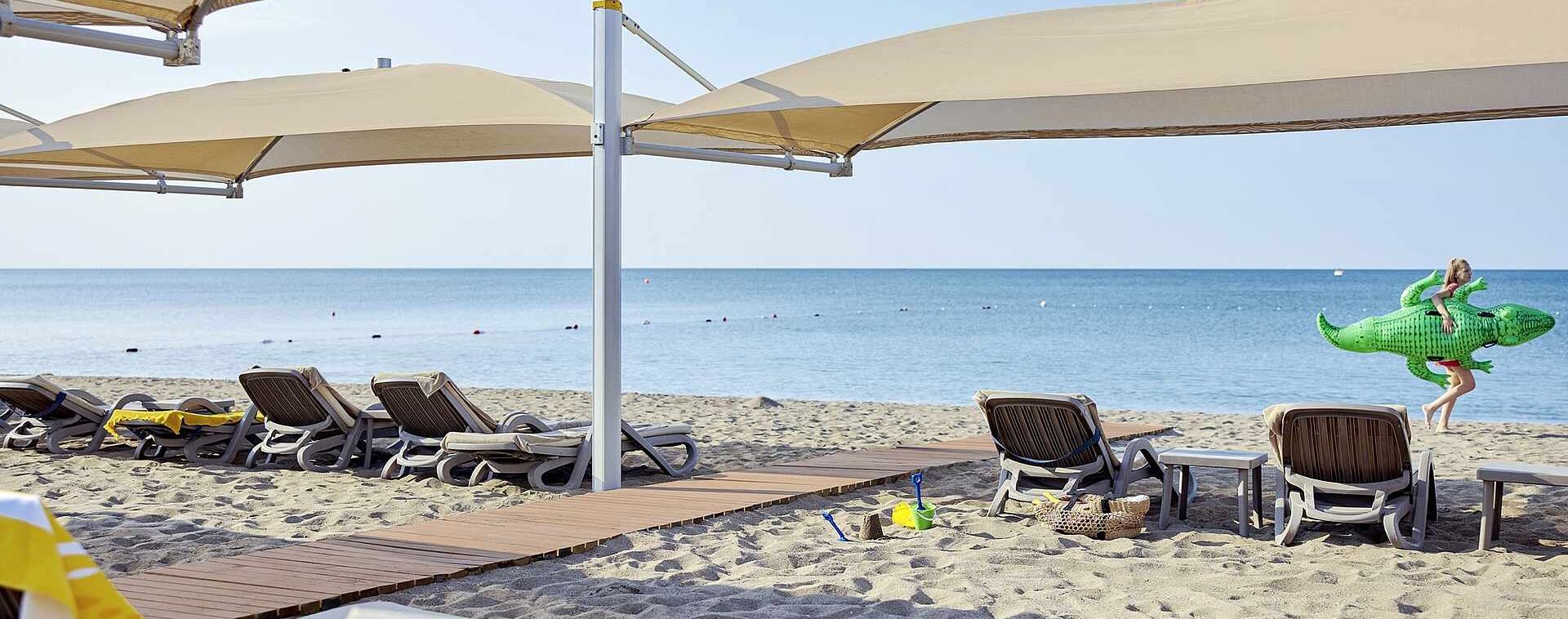 Собствен, пясъчен, с дължина на плажната ивица 250 м. и кей 400 м2. Чадъри, шезлонги и матраци на плажа и при басейна - безплатно. Плажни кърпи – безплатно.