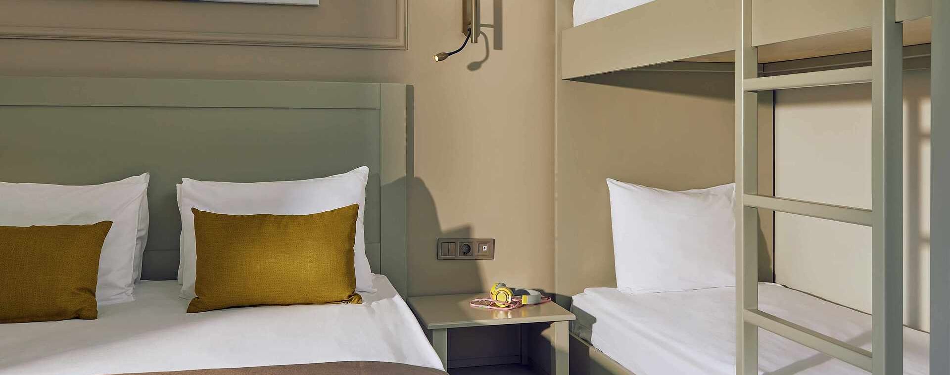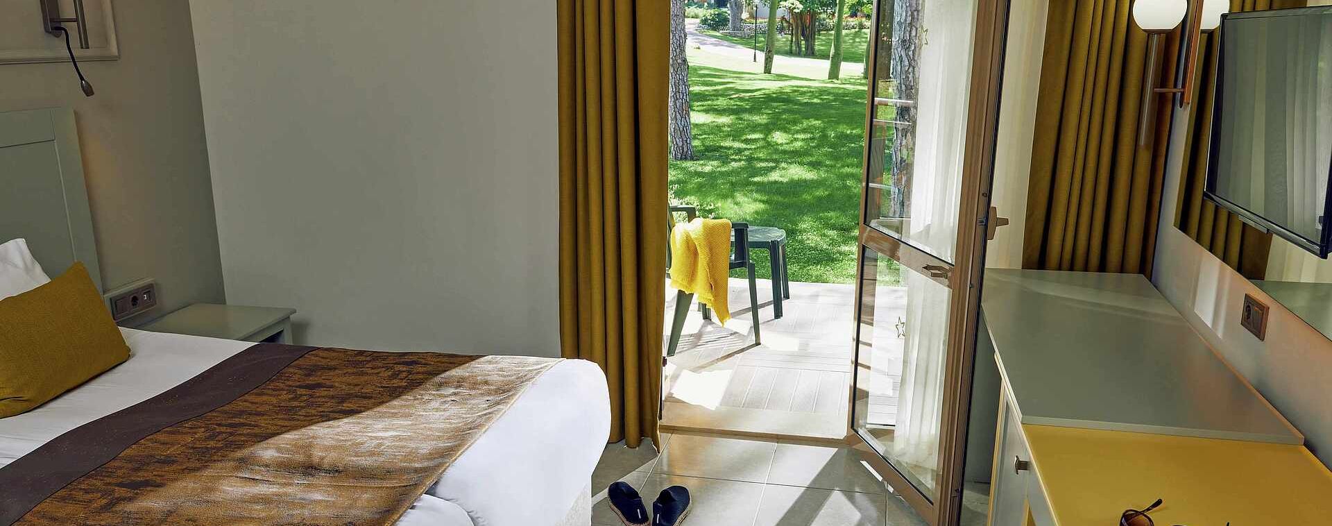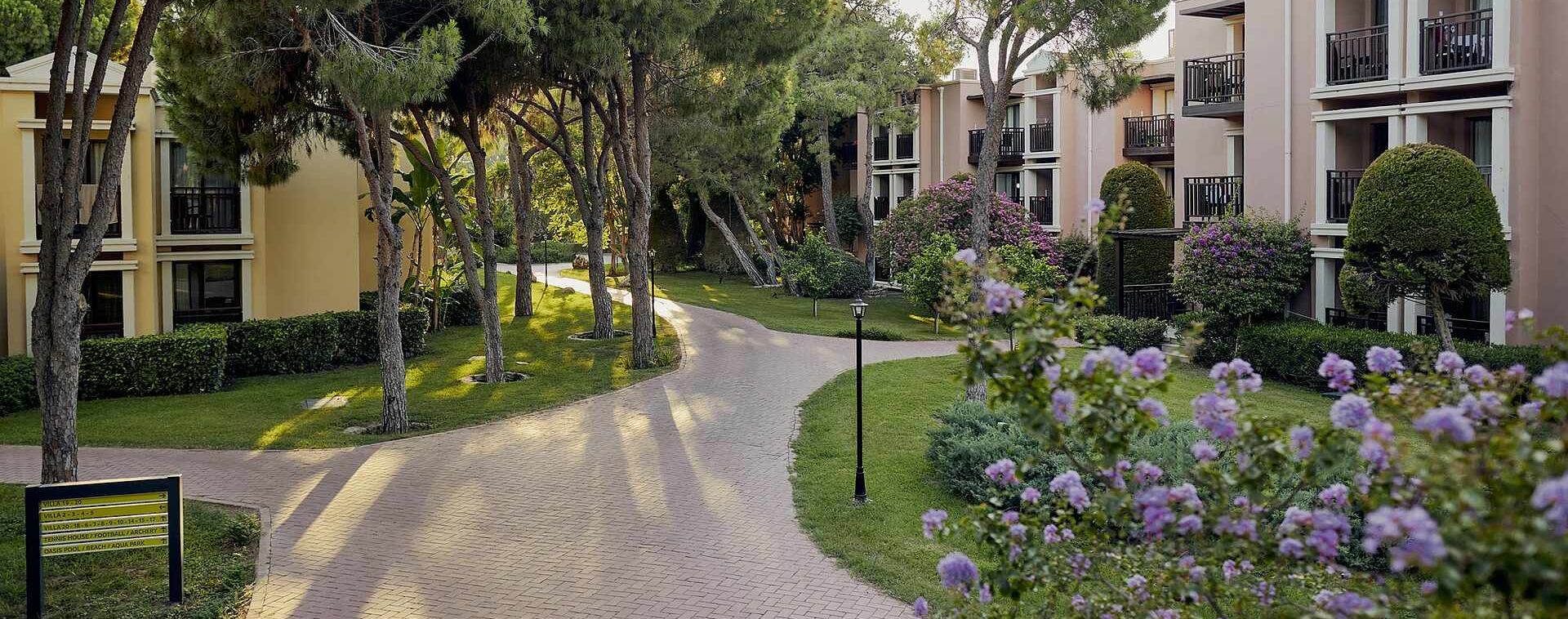 Хотелът разполага с общо 594 стаи, разположени в 20 дву и три-етажни къщички, от които 370 стандартни стаи Standard room (24 м2), 126 стандартни стаи с двуетажно легло Standard Room with Bunk Bed (24 м2), 92 фамилни стаи Family room (2 спални, 1 баня - 46 м2). Всички стаи са оборудвани с климатик, телевизор, телефон, баня с душ/вана, сешоар, чехли, минибар (вода, бира, безалкохолни напитки - безплатно), сейф (безплатен). Почистване на стаите - всеки ден, смяна на спално бельо и кърпи – 3 пъти в седмицата.
