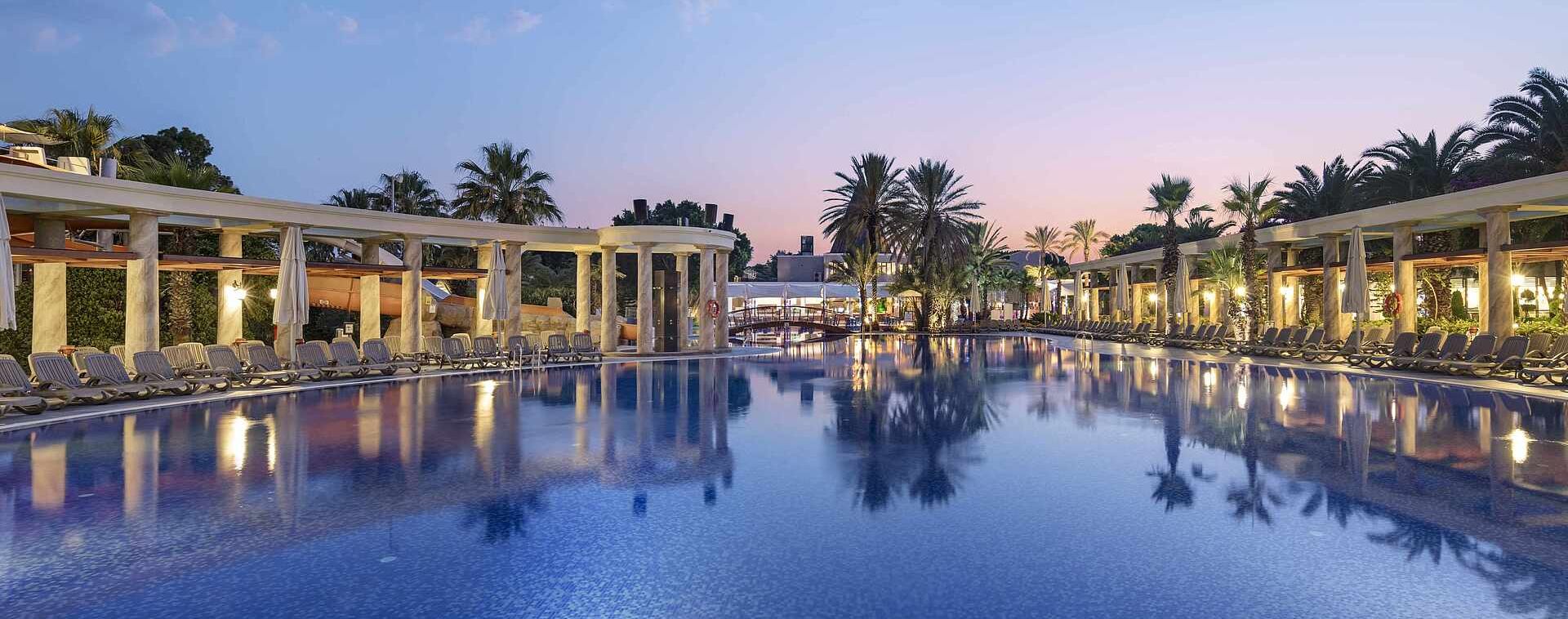 Основен ресторант, 4 а - ла - карт ресторанта (турски, италиански, рибен, китайски - с предварителна резервация), 8 бара, 3 открити басейна (активити, релакс и басейн на плажа), дискотека, водни пързалки, СПА център, магазини, паркинг, Wi-Fi (безплатен). За децата: Два открити басейна, детска площадка, мини клуб (4-12г.), джуниър клуб (13-16г.), батут за скачане, детско меню, детска количка (платено), музикални игри, детегледачка (платено). Безплатни услуги: Сауна, турска баня, тенис на маса, 3 тенис корта, фитнес, дартс, боча, билярд, скуош, водна гимнастика, аеробика, плажен волейбол, мини футбол, стрелба с лък, тематични вечери, анимация. Платени услуги: Масаж, пилинг, уроци по тенис, уроци по скуош, осветление за тенис корт, катамаран, химическо чистене, лекар, детегледачка, водни спортове, рент - а кар.