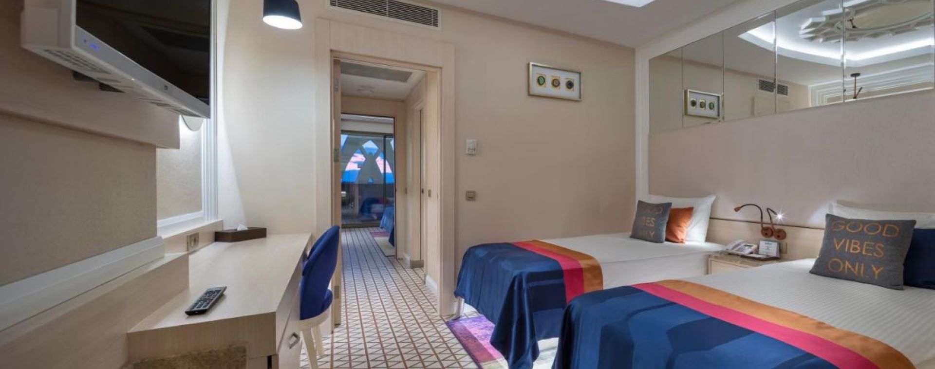 Хотелът разполага с общо 872 стаи, от които 580 стандартни стаи и 292 различни типове фамилни стаи. Всички стаи са оборудвани с: климатик, сателитна телевизия, телефон, баня с душ или вана, сешоар, минибар (със зареждане всеки ден), сейф (безплатeн), балкон. Почистване на стаите – всеки ден, смяна на бельото и кърпите – 3 пъти в седмицата.