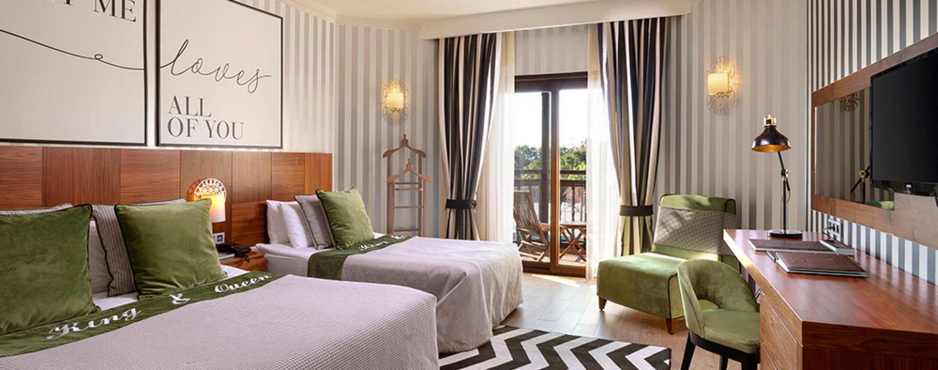 Хотелът разполага с общо 455 стаи, 278 разположени в 2 основни сгради Main building (4-6 етажа) и 177 стаи във сгради Nature (2 или 3 етажа), от които 192 Main Building Standard Room (17-25 м2), 50 Garden Room (някои от стаите не разполагат с балкон  - 17 м2), 177 Nature Room (25 м2), 14 Suite Room (спалня, дневна, кухненски бокс  - 50-53 м2), 22 Family Suite Room (2 отделни спални, дневна, кухненски бокс и трапезария  - 64 м2).