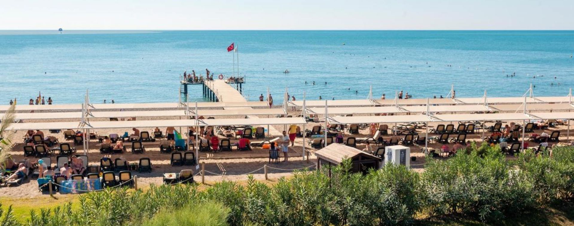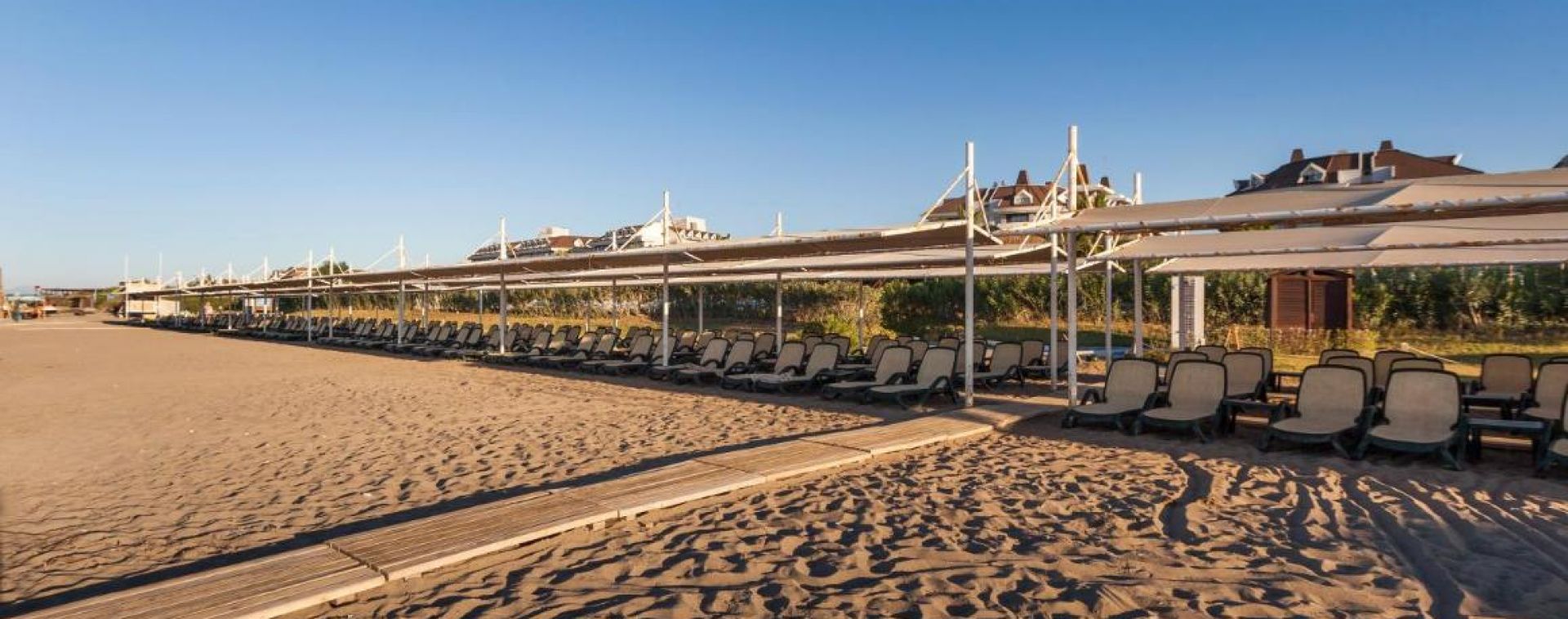 Собствен, пясъчно - чакълест. Чадъри, шезлонги и плажни кърпи на плажа и при басейна – безплатно.