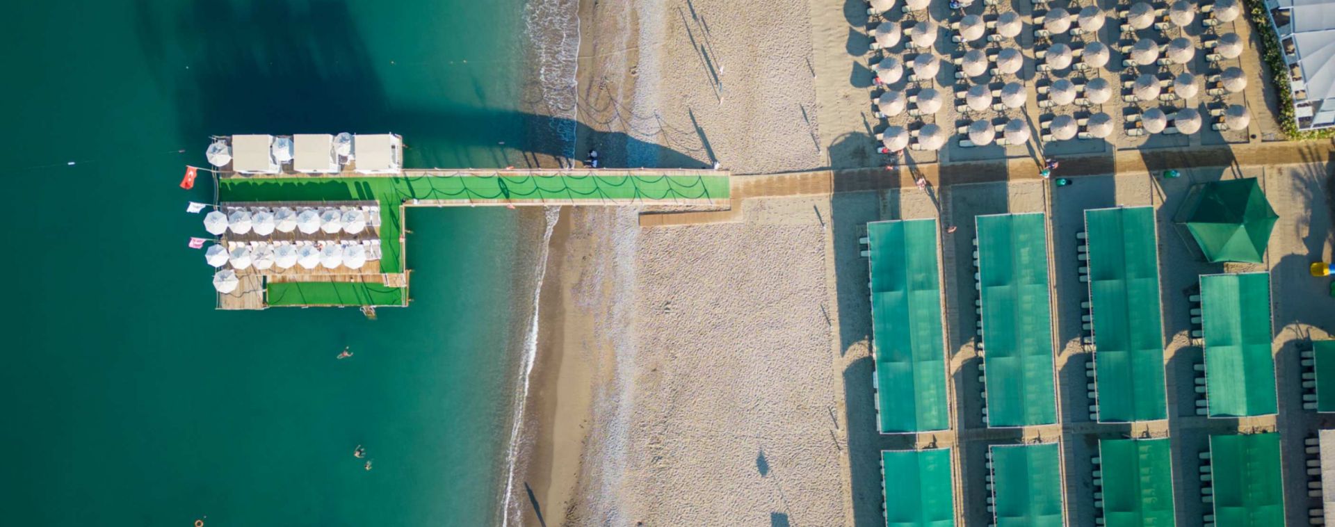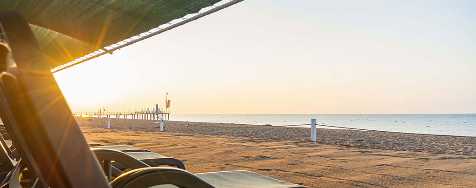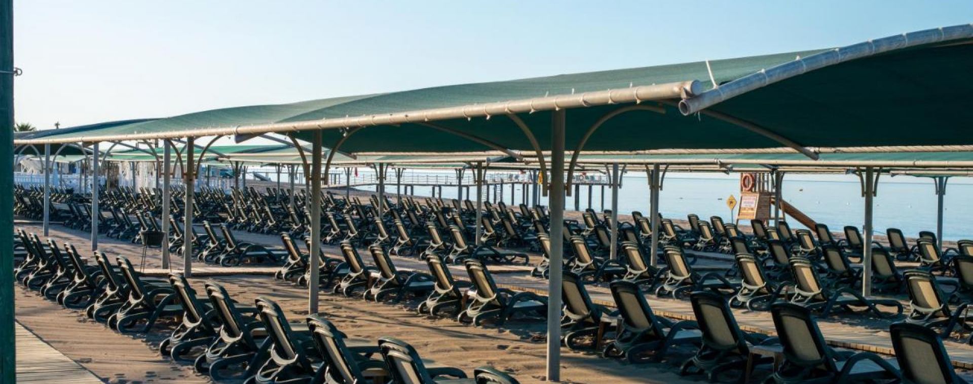 Собствен, пясъчно - чакълест. Чадъри, шезлонги и плажни кърпи на плажа и при басейна – безплатно.