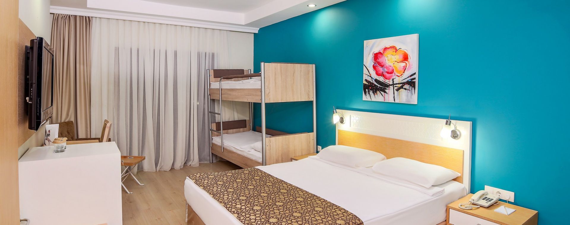 Стаи Land View room (спалня, баня, с изглед суша - 20 м²), Large room land view (1 спалня с две легла, 1 баня, изглед суша - 23 м²) Standard room side sea view (1 спалня с две легла, 1 баня, със страничен изглед море - 23 м²), Room with bunkbed (1 спалня, 1 двуетажно легло, 1 баня, изглед суша - 23 м²), Fаmily Room Land View (2 спални, 1 баня, изглед суша, в отделен корпус - 34 м²), Family room with bunkbed (2 спални с двуетажно легло, 1 баня, изглед суша, в отделен корпус - 34 м²).