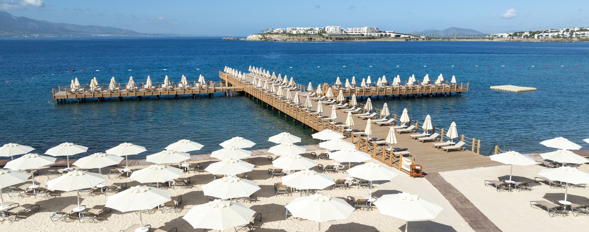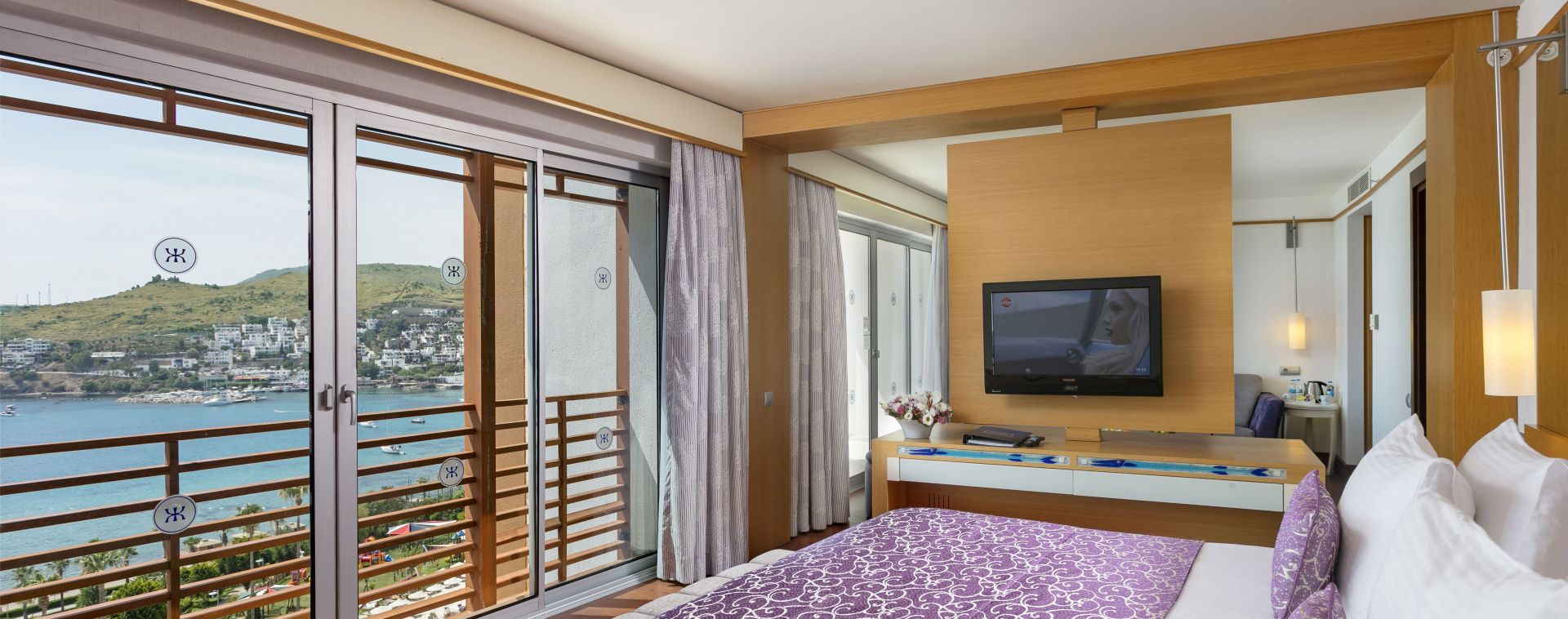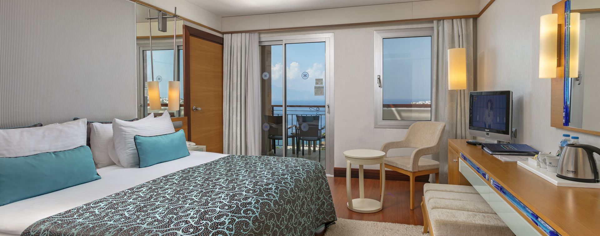 Стаи Main Building: Sea view room (спалня, баня, балкон - 27 м²), Deluxe Room Sea View (спалня, баня, балкон - 36 м²), Standard large room sea view (спалня със зона за сядане, баня, балкон - 34 м²), Junior suite room sea view (спалня със зона за сядане, баня, балкон - 56 м²), Family suite room sea view (2 спални, баня, тераса - 79 м²), Connection room sea view (2 спални с топла връзка, баня, тераса - 54 м²), Superior Suite Swim Up (2-етажна вила с 2 спални, с директен достъп до общ басейн, баня - 180 м²).