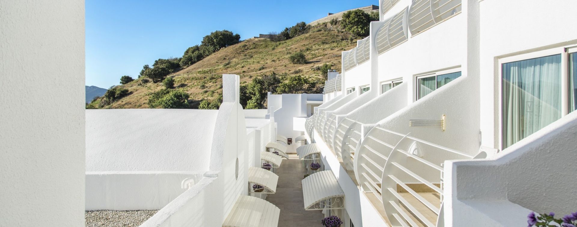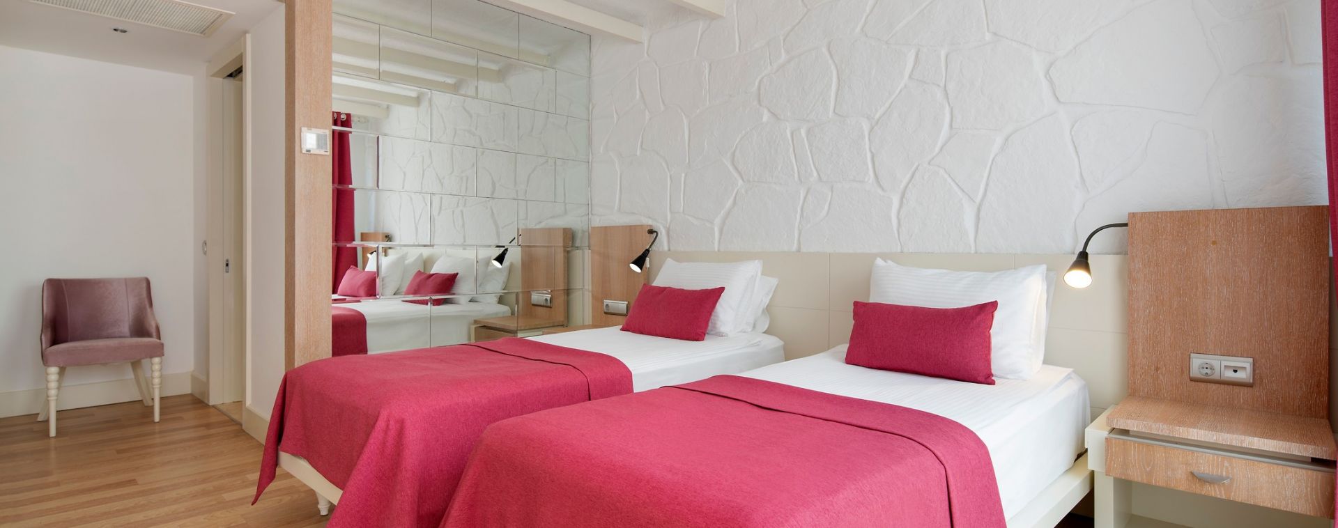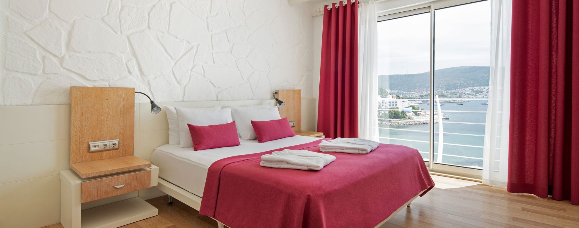 Стаи: Standard room without balcony land view (1 спалня или 2 единични легла, 1 баня, изглед суша, без тераса - 19 М²), Standard room with balcony land view (1 спалня или 2 единични легла, 1 баня, изглед суша, с тераса - 19 М²), Standard room with balcony sea view (1 спалня или 2 единични легла, 1 баня, изглед море, с тераса - 19 М²), Junior suite room sea view (1 спалня, 1 хол, 1 баня, изглед море, с тераса - 53 М²).