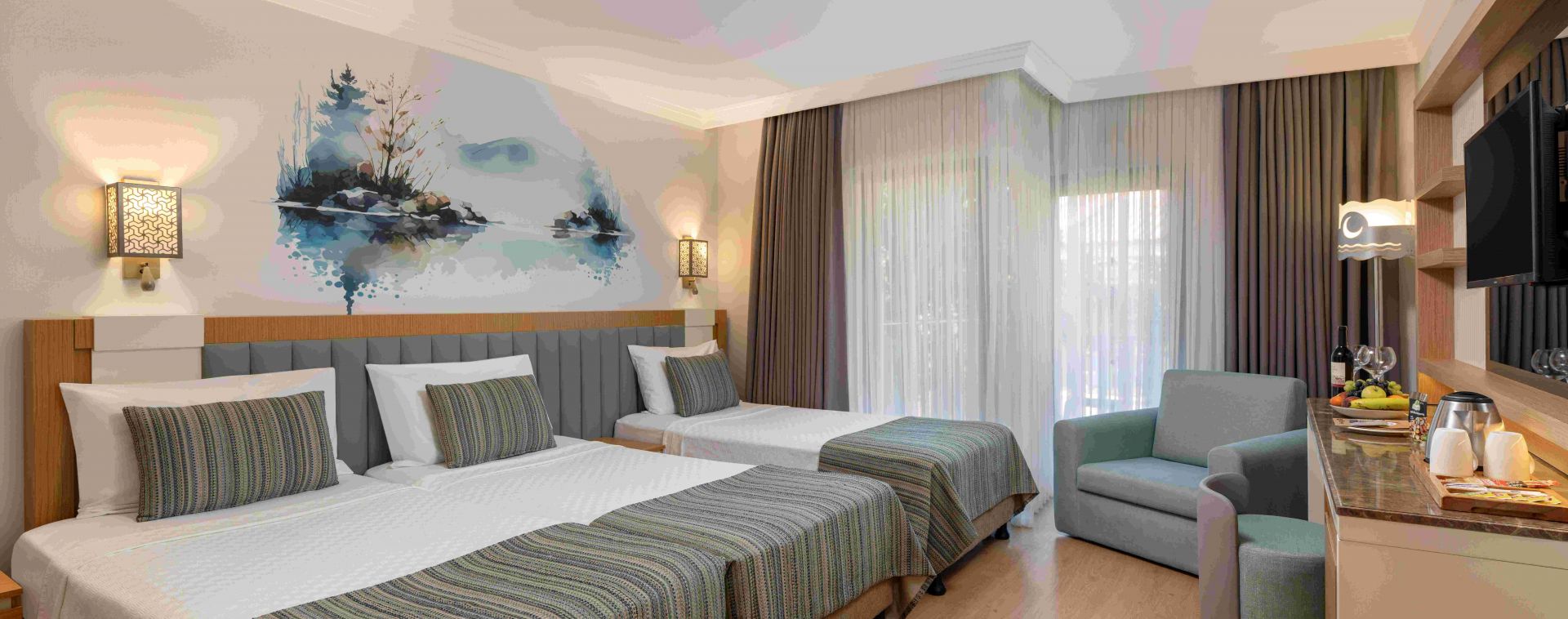 Стаи Arycanda: 246 Standard room sea/pool side (изглед море/басейн - 28 м2), 7 Junior Suits (1 спалня, 1 диван, 1 баня - 35 м2).