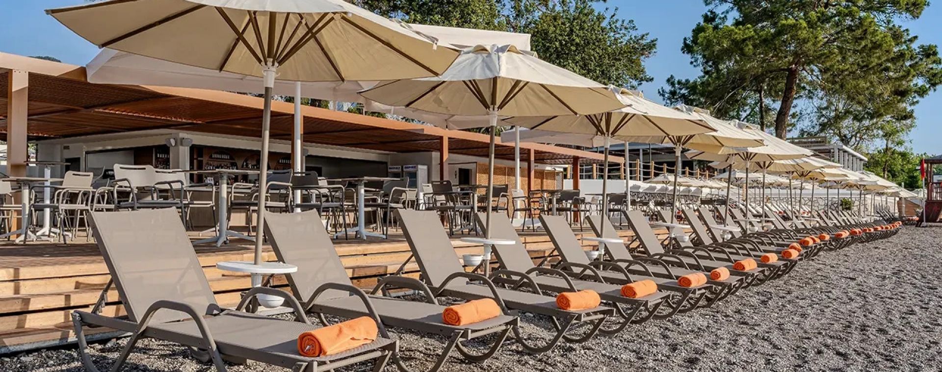 Собствен, пясъчно – чакълест, притежаващ сертификат „Син флаг“, с дължина на плажната ивица 200м. Чадъри, шезлонги и плажни кърпи на плажа и при басейна – безплатно.