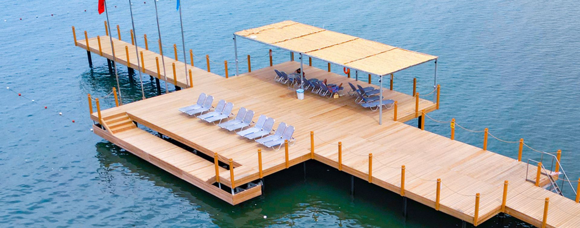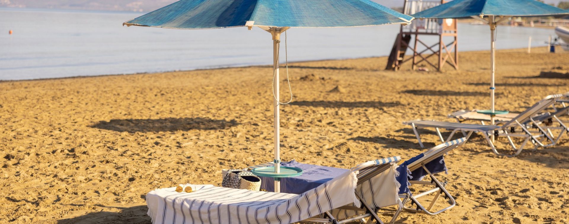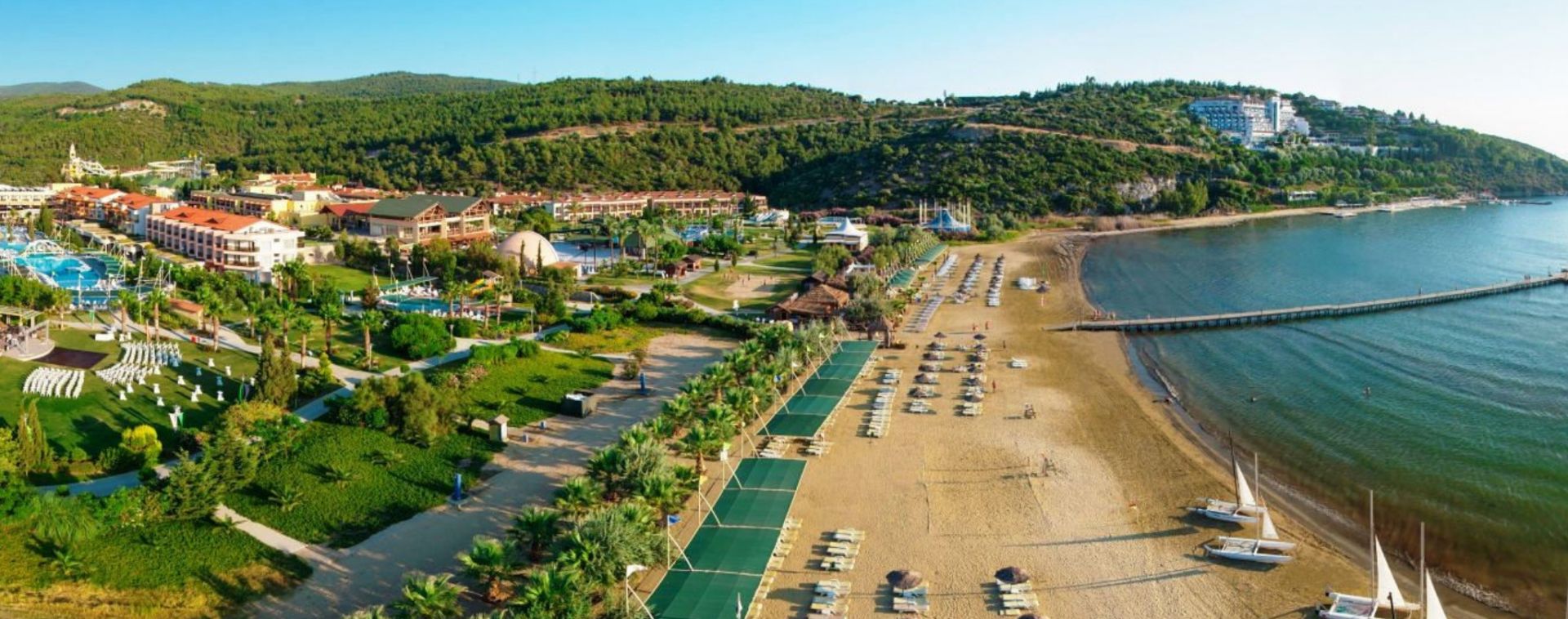 Собствен, пясъчен с дължина 300 м, притежаващ сертификат "Син флаг" и кей със 150 м дължина. Чадъри, шезлонги, матраци и плажни кърпи на плажа и при басейна - безплатно.