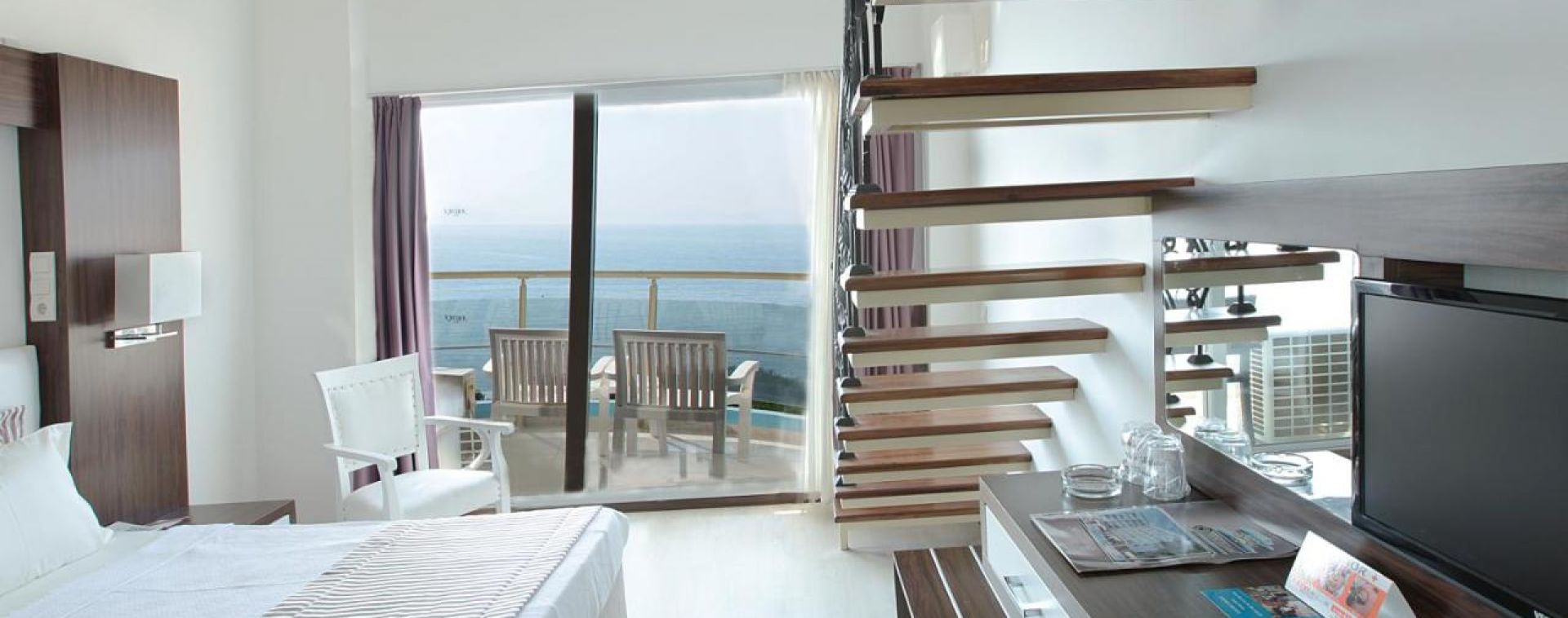 Хотелът разполага 137 стаи, от които 127 стандартни (113 с изглед море и 24 с изглед градина, 20-24 кв.м), 8 дуплекс фамилни (2 единични легла на долния етаж и спалня на горния етаж, без свързваща врата, 25-26 кв.м), 1 суит и 1 стая за инвалиди . Всички стаи са оборудвани с климатик, телевизор, телефон, баня с душ, сешоар, минибар хладилник, сейф (безплатен), балкон. По-голяма част от стаите са с изглед море.