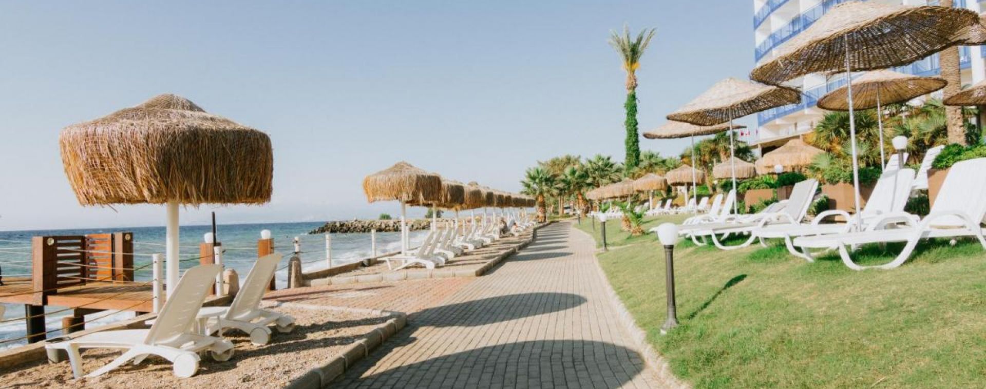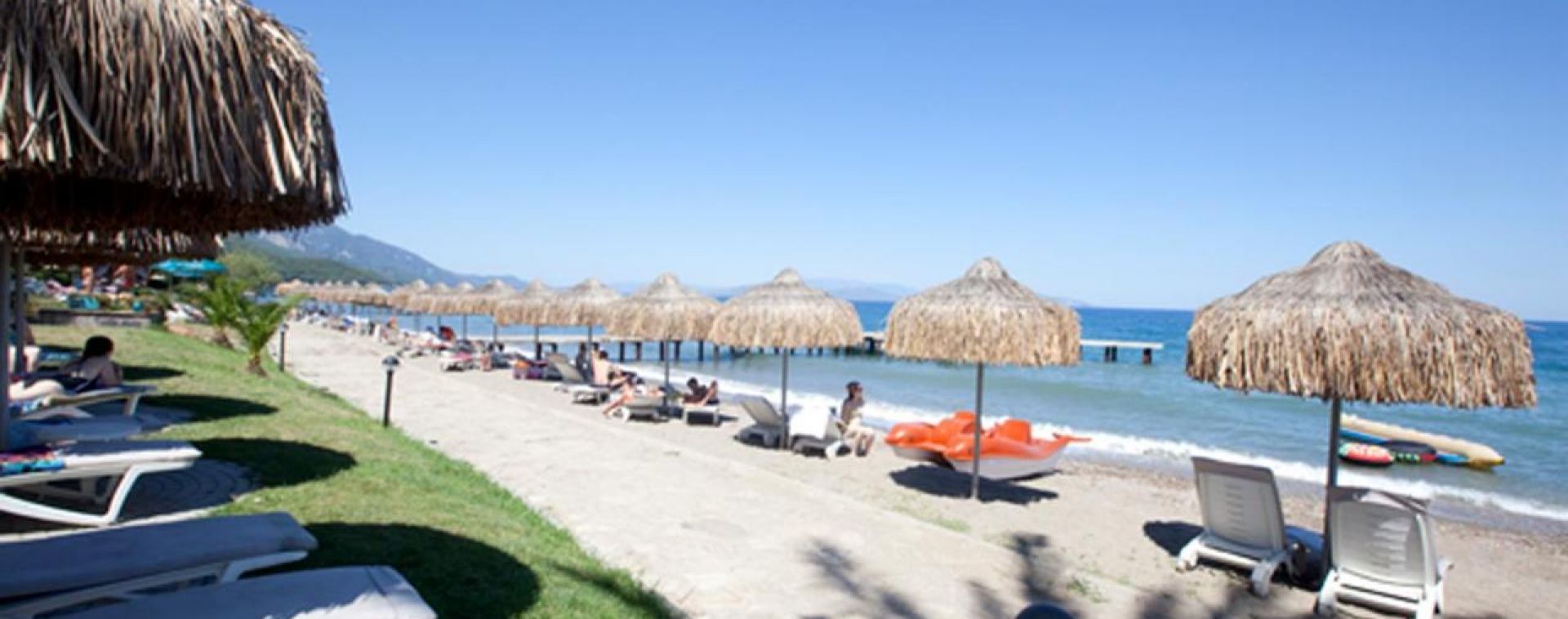 Плаж: собствен, пясъчно-чакълест. Чадъри и шезлонги на басейна и плажа - безплатно.