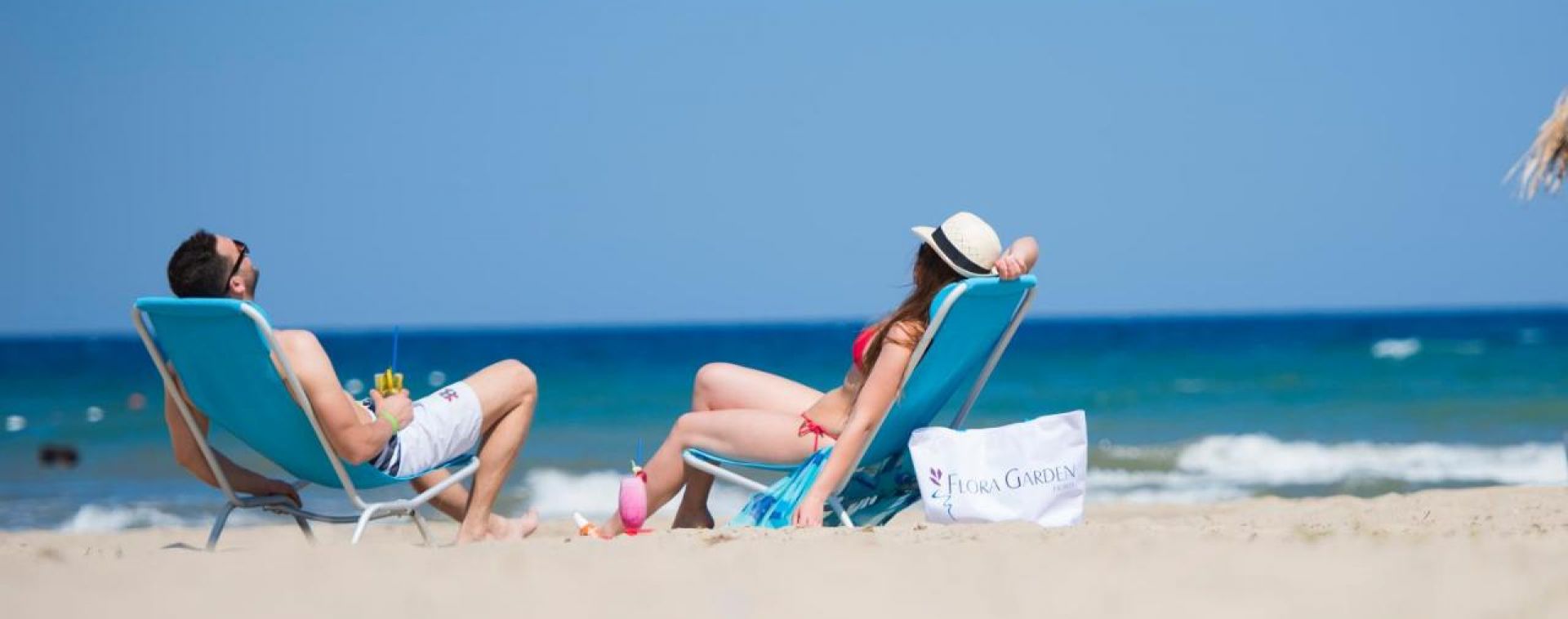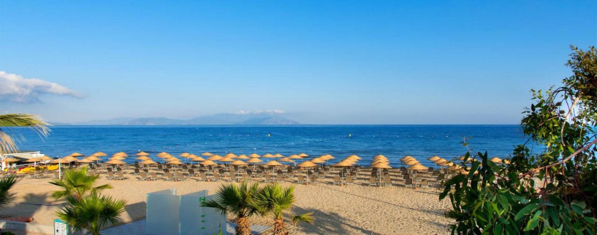 Собствен, пясъчен, притежаващ сертификат "Син флаг". Чадъри, шезлонги и плажни кърпи при басейна и на плажа - безплатно.