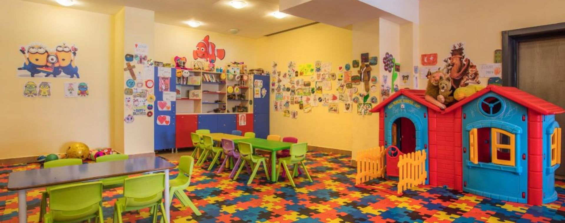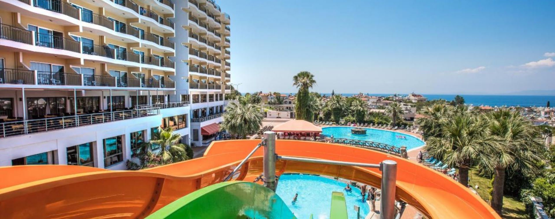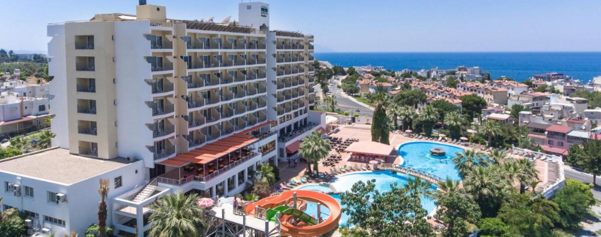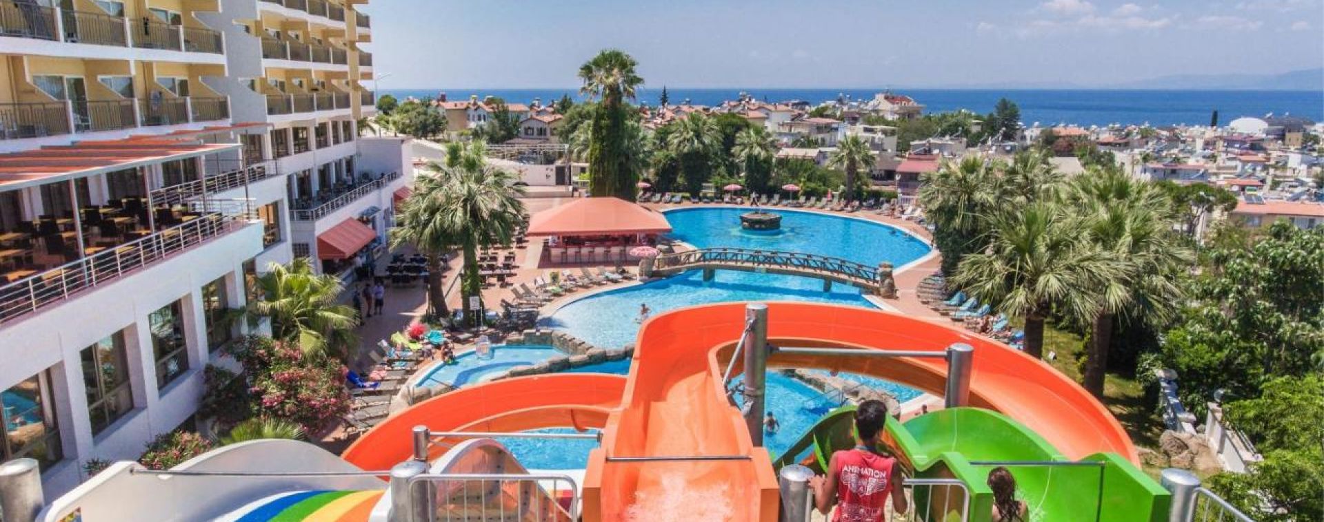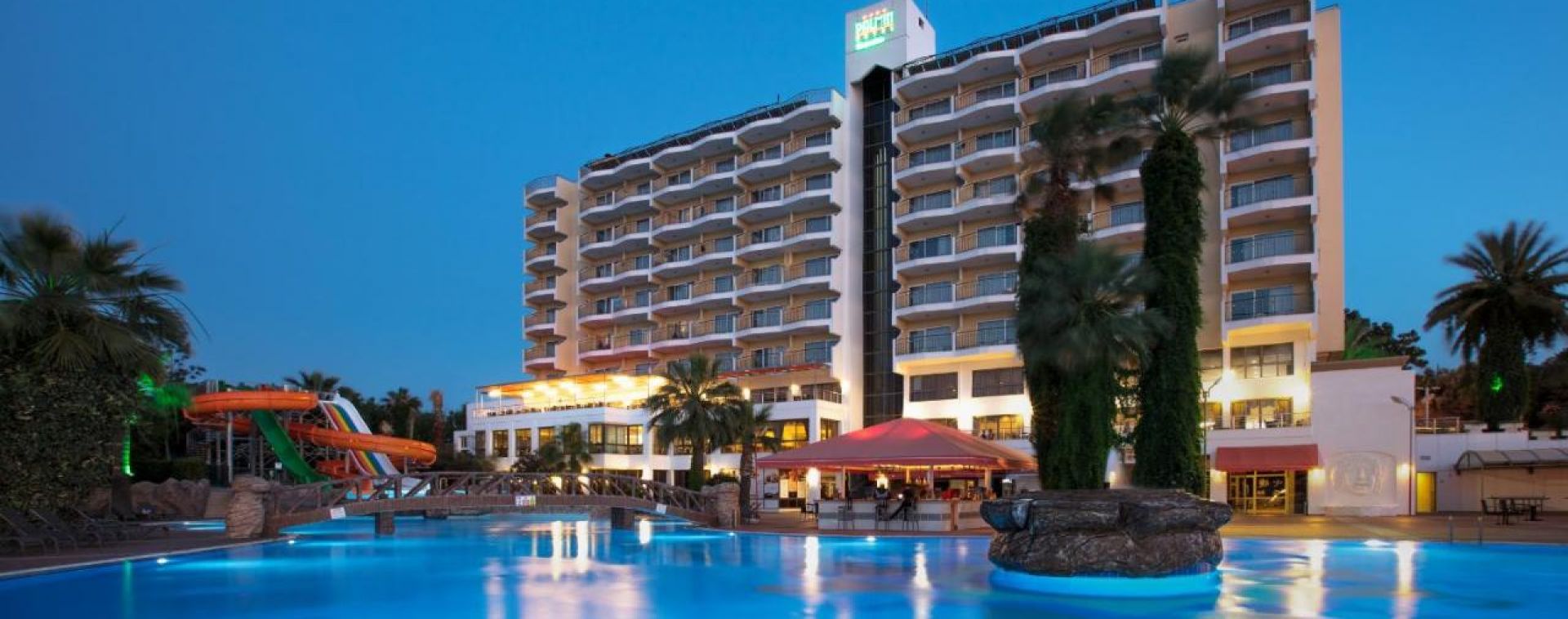 Основен ресторант, 2 бара, 2 открити басейна, закрит басейн (отопляем през студените месеци), водни пързалки, тв зала, магазини, паркинг.