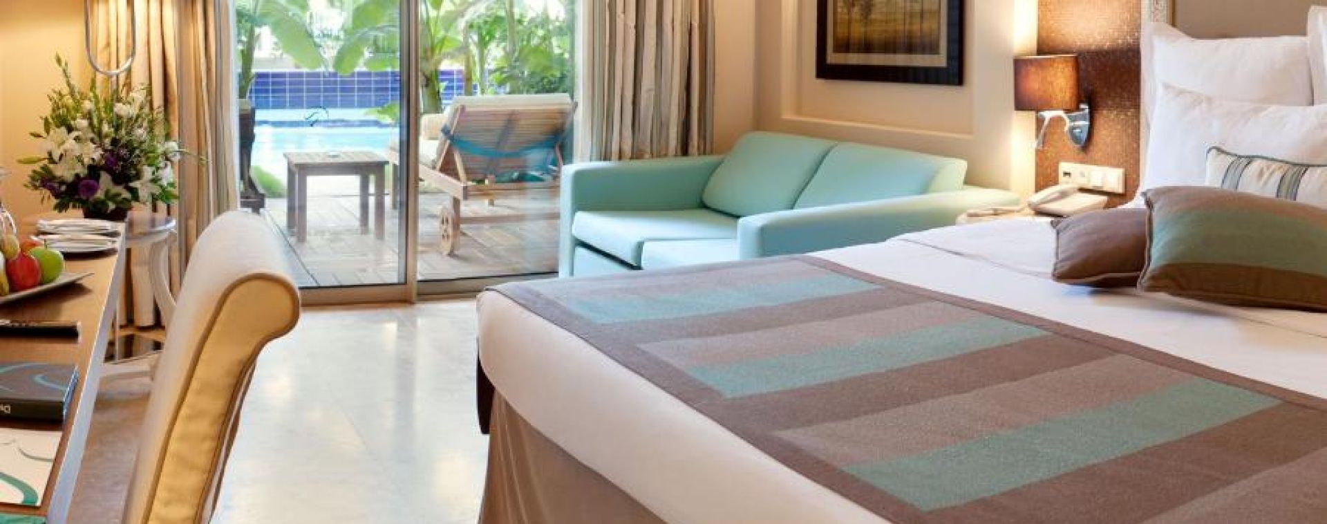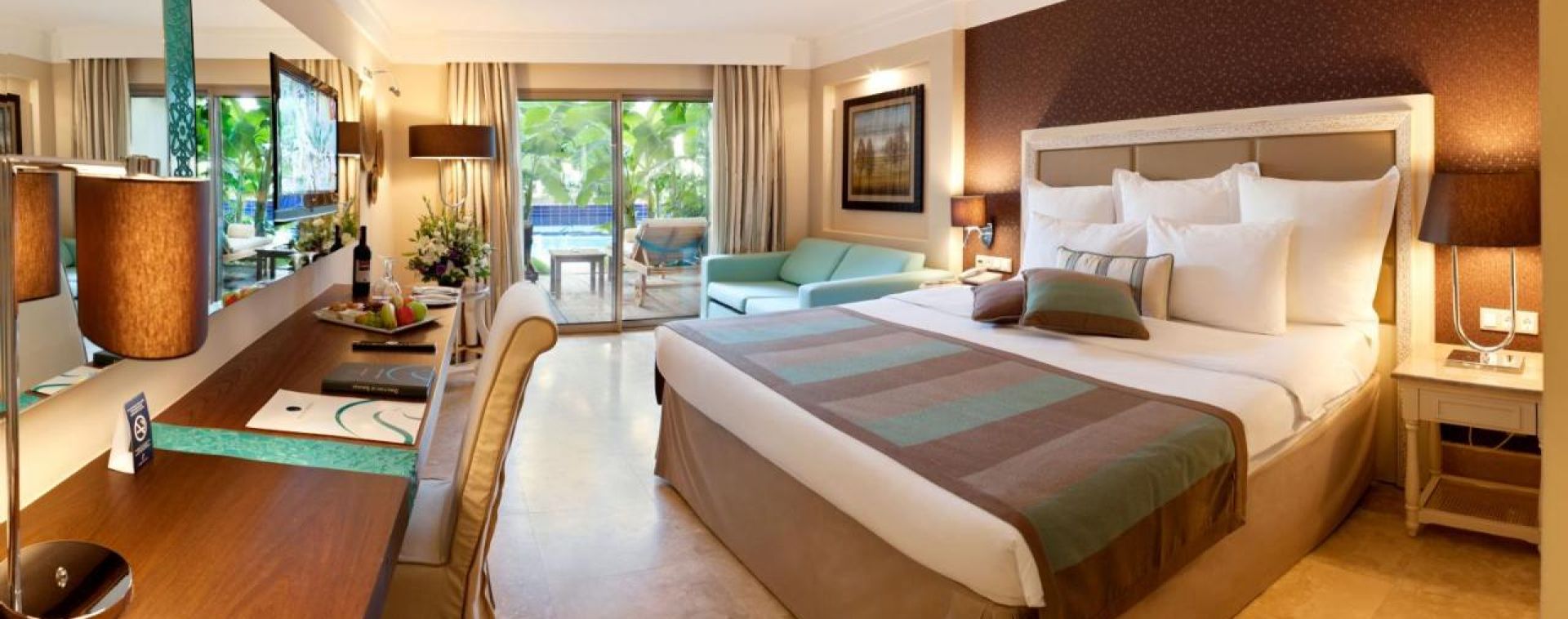 Хотелът разполага с общо 268 стаи, разпределени в два 5-етажни корпуса: 88 Standard garden view (33 кв.м), 104 Standard sea view (33 кв.м), 36 Standard Pool Side (директен достъп до басейна, с индивидуална тераса с шезлонги - 33 кв.м), 20 Terrace Suite стаи (директен изглед към море, джакузи на терасата, безплатен рум сървис 24/7, комплимент при настаняване - 70 кв.м), 20 Family Suites (гледка градина, спалня и всекидневма с преградна врата, баня с душ и вана - 65 кв.м), 2 Handicapped (пригодени за хора с ограничена подвижност - 33 м2). Всички стаи са оборудвани с климатик, телевизор, телефон, баня с душ, сешоар, сет за чай/кафе, минибар (ежедневно зареждане с вода и безалкохолни напитки - безплатно), сейф (безплатно), балкон.