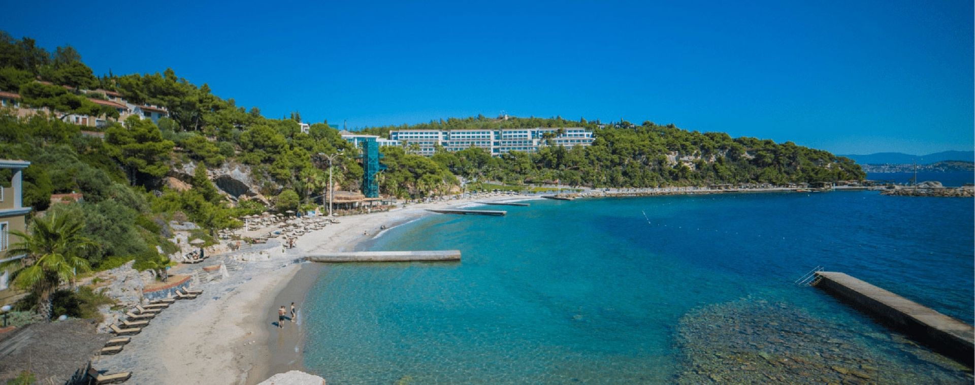 Собствен, пясъчен с дължина 1200 м, притежаващ сертификат "Син флаг" и платформа. Чадъри и шезлонги на плажа и при басейните – безплатно. Плажни кърпи - безплатно.