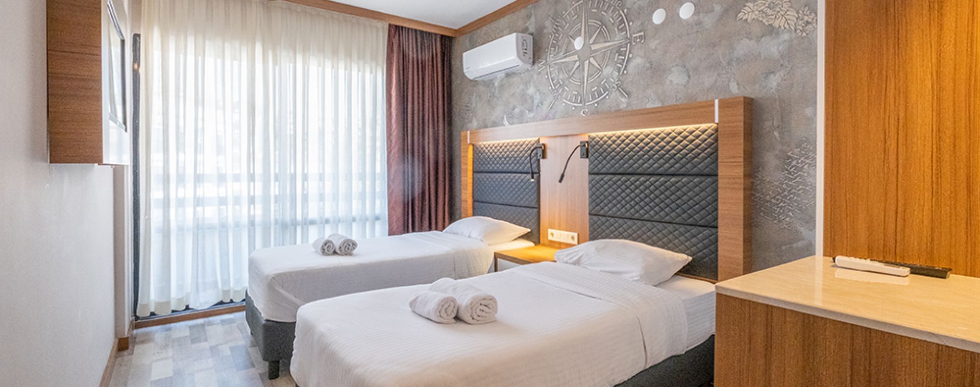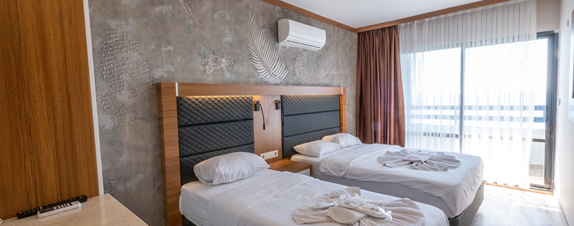 Хотелът разполага общо с 60 стаи (17-20 м2), по-голямата част от които са с изглед море (частичен или фронтален). Всички стаи са оборудвани с климатик, телевизор, телефон, баня с душ, сешоар, минибар, сейф (безплатно), балкон.