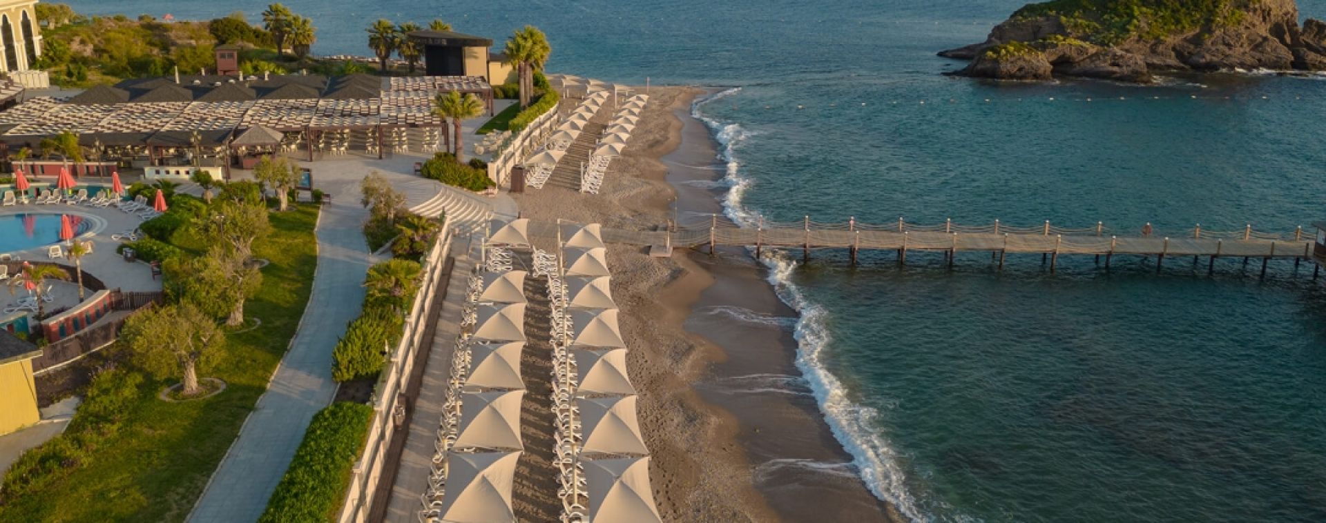 Собствен, пясъчно-чакълест, притежаващ сертификат "Син флаг" и платформа. Чадъри, матраци, шезлонги и плажни кърпи при басейна и на плажа – безплатно.