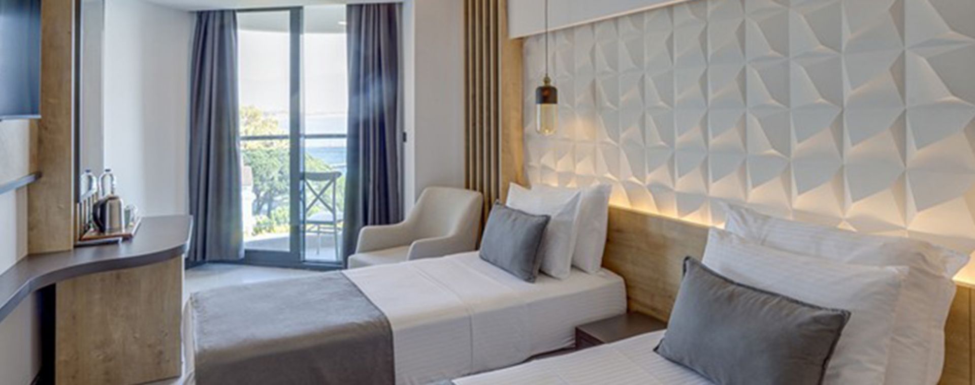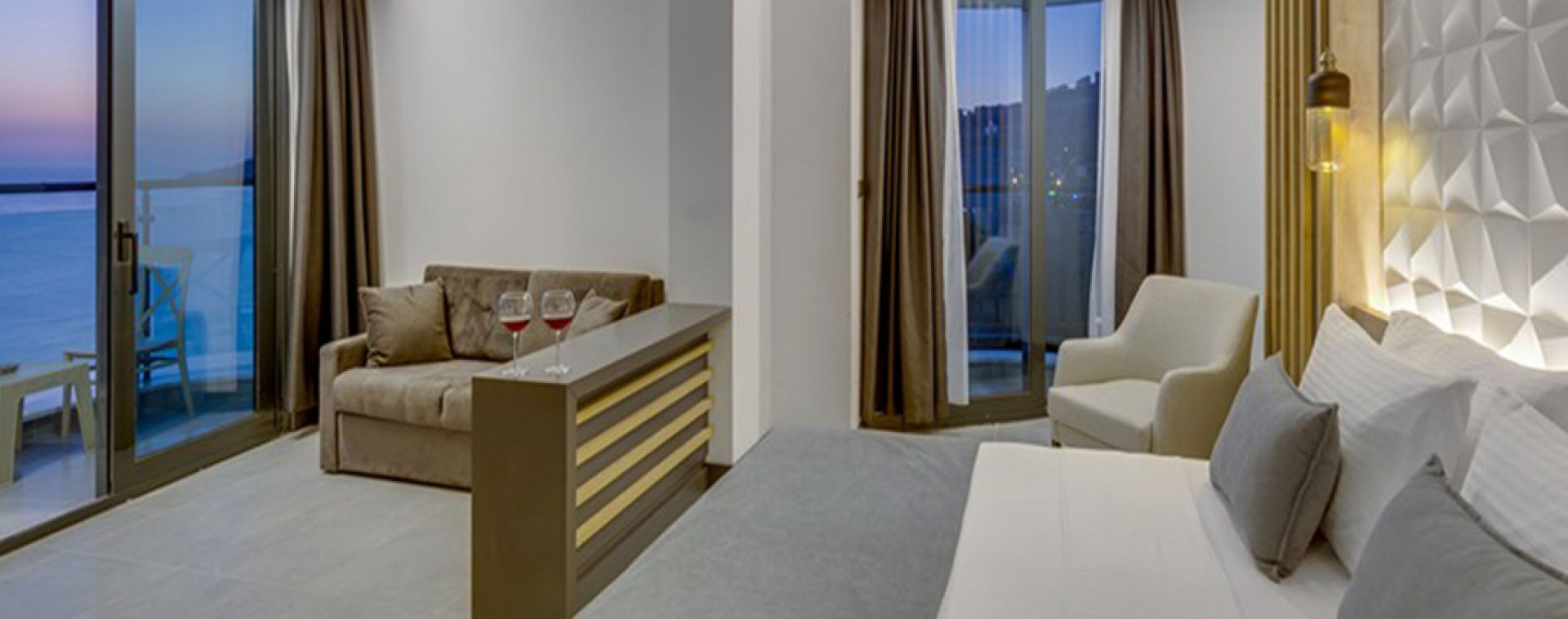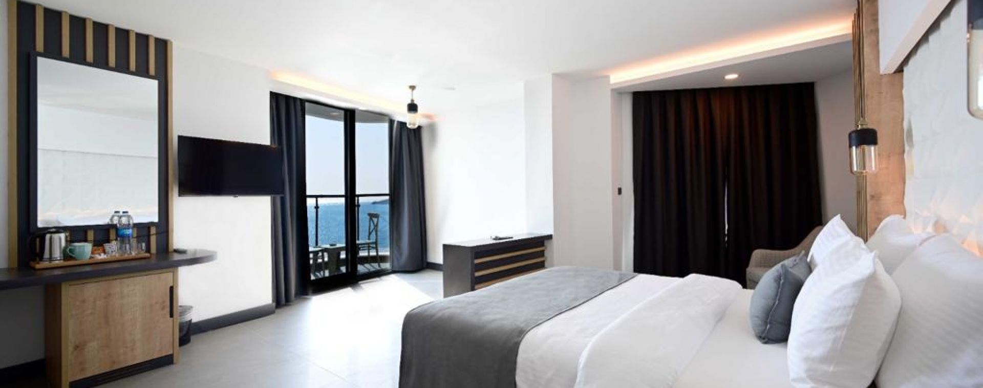 Хотелът разполага с 111 стаи с модерен дизайн, от които 91 deluxe room (22 кв.м, с изглед море), 6 junior suite (30кв.м), 6 corner room (24 кв.м), 1 King Suit (1 спалня, 1 хол, 35 кв.м), 7 promo room (22 кв.м, без изглед море), всички оборудвани с климатик, телевизор, сешоар, телефон, баня с душ / вана, сет за чай / кафе, мини бар, сейф, Wi-Fi, балкон или тераса. Почистване на стаите - всеки ден.