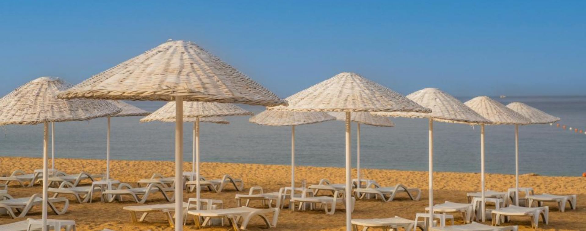 Собствен, пясъчно - чакълест с дължина 650 м. Чадъри, шезлонги и плажни кърпи на плажа и при басейна – безплатно.