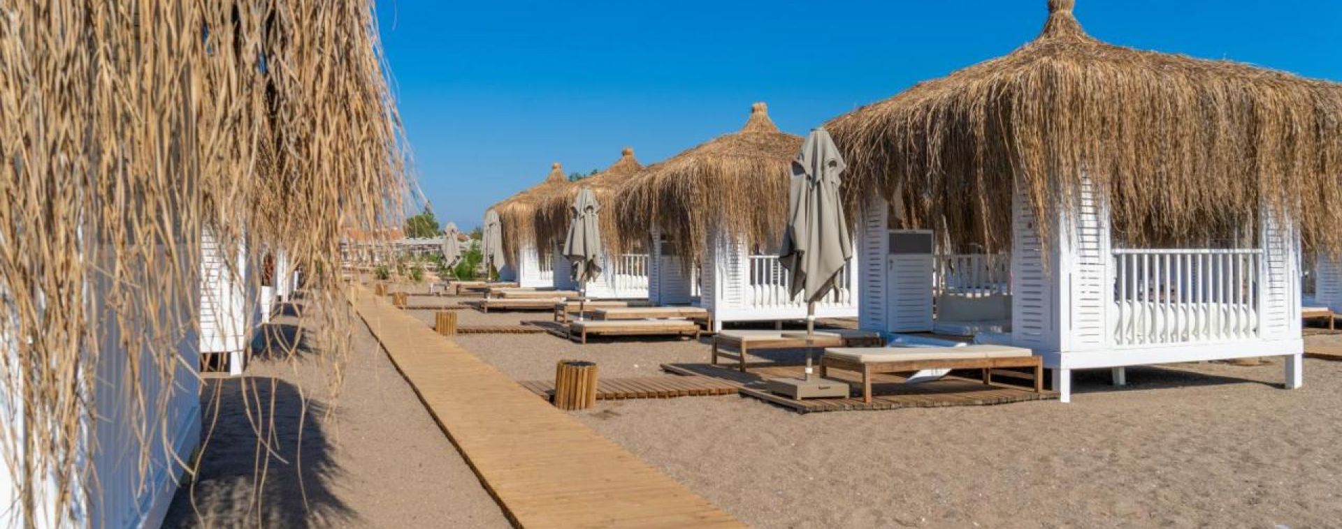 Собствен, пясъчен. Чадъри и шезлонги на плажа и при басейна - безплатно. Плажни кърпи - безплатно. Кабани - срещу заплащане.