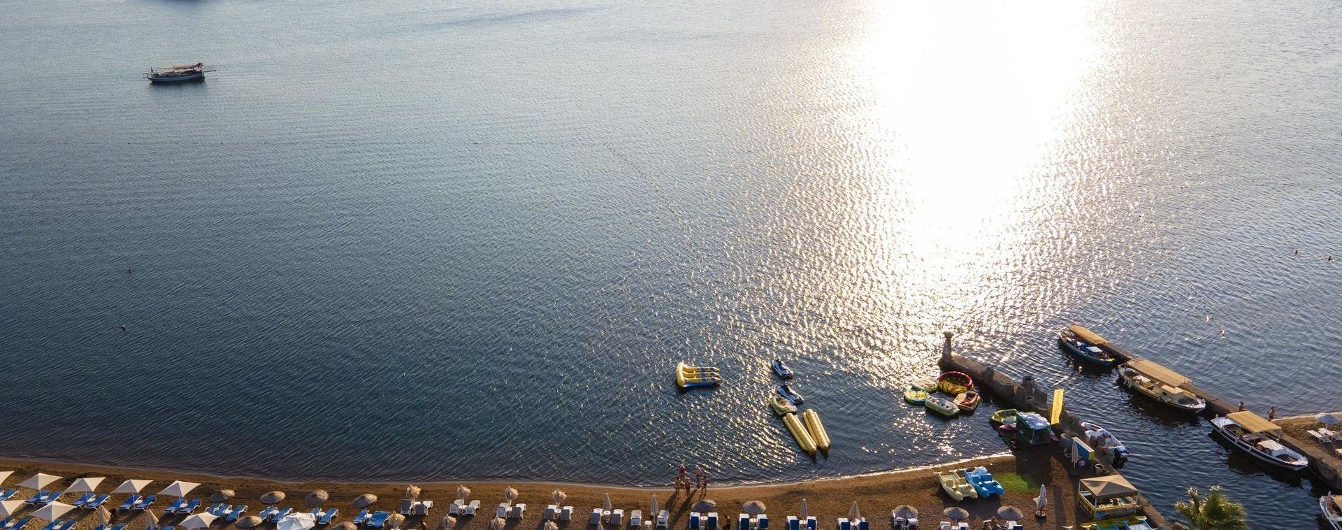 Собствен, пясъчен. Чадъри, шезлонги и матраци на плажа и при басейна – безплатно.