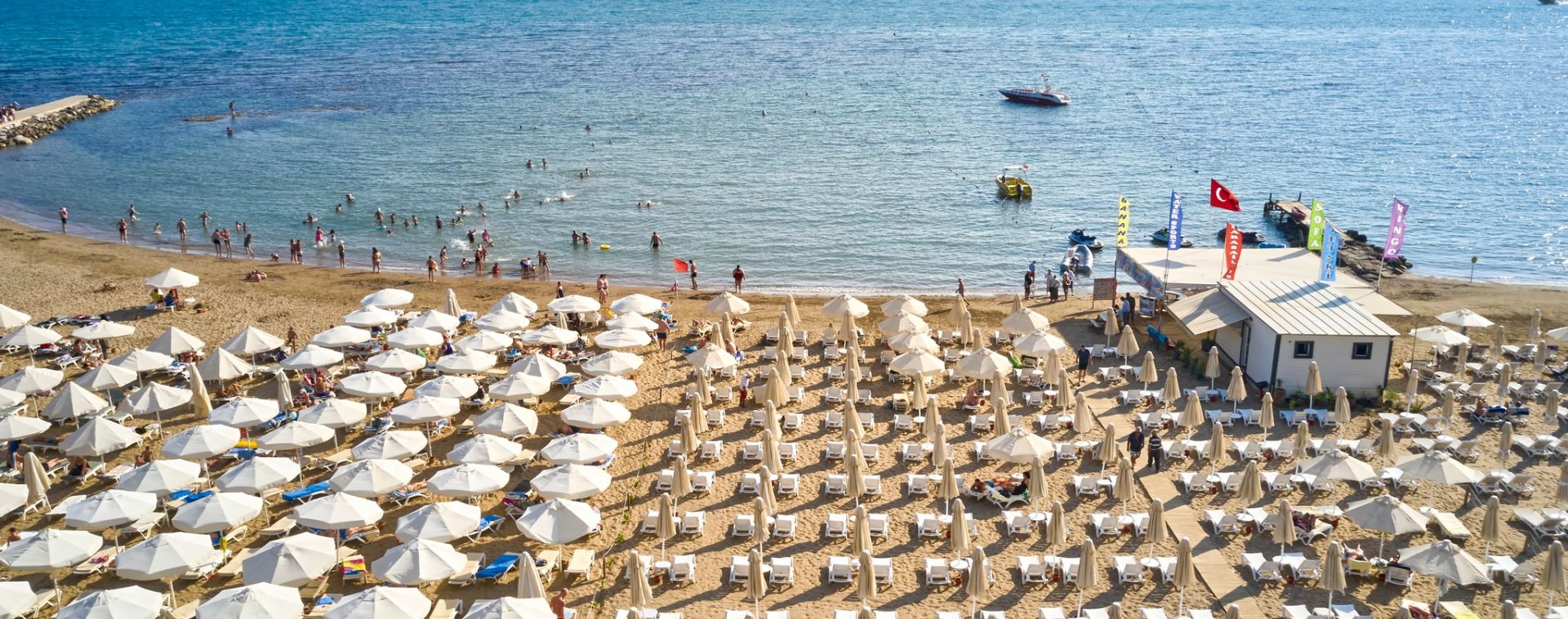 Собствен, пясъчен, със сертификат Син флаг. Чадъри, шезлонги и матраци на плажа и при басейна - безплатно.