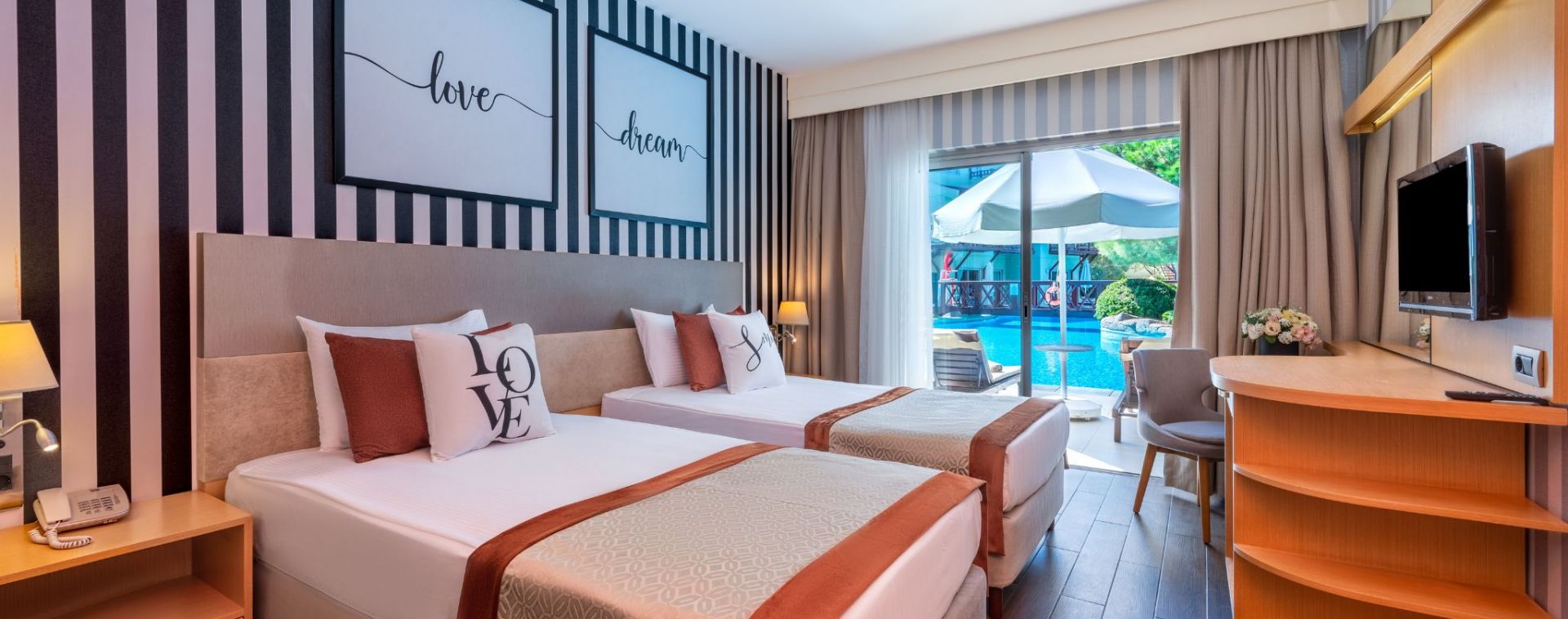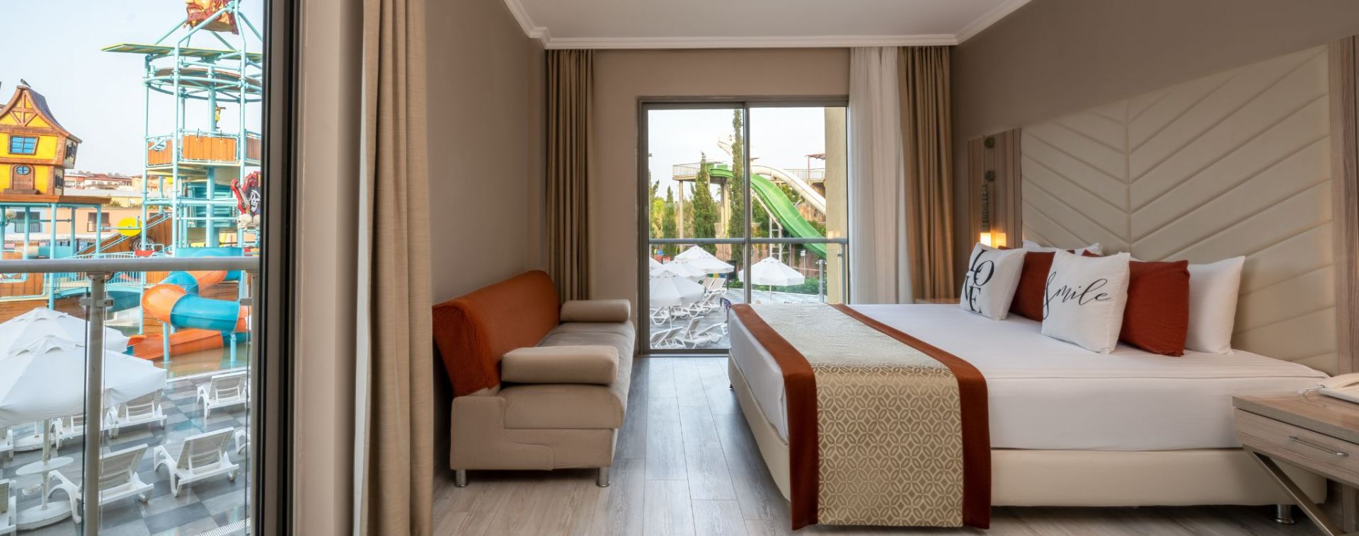 Стаи Aqua Building: 105 Aqua Room (изглед градина или басейн, 27 м2), 17 Aqua Family Room (2 спални, изглед градина или басейн - 45 м2).