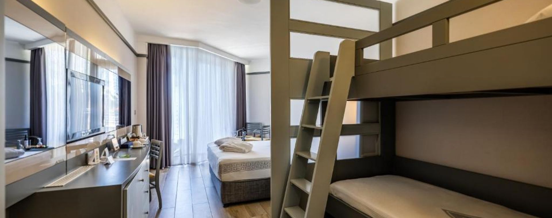 312 Standard Room (изглед суша или страничен изглед море - 24 м2), 4 Handicapped Room (пригодени за хора с ограничена подвижност - 24 м2), 45 Family BunkBed Room (двойно и двуетажно легло, изглед градина - 29 м2), 35 Family Room (2 спални, двойно и две единични легла - 42 м2), 56 Suite Room (две спални, двойно и две единични легла, хол, изглед море – 56 м2).
