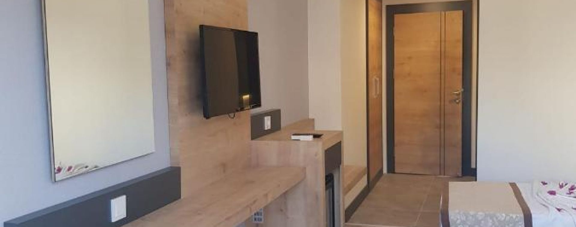 На 900 м. от плажа. Чадъри, шезлонги и матраци на плажа и на басейна – безплатно.