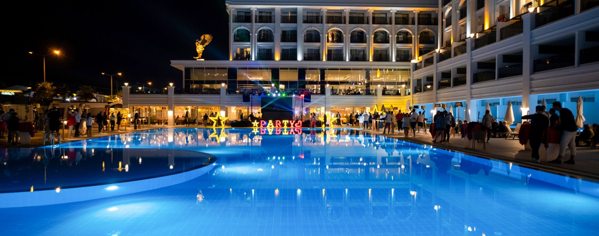 Основен ресторант, 4 а-ла-карт ресторанта - рибен, турски, италиански (1 безплатно посещение на 1 от ресторантите при минимум 7 нощувки), стек (срещу заплащане с предварителна резервация), сладкарница, Starbucks кафе, 6 бара, 2 открити и 1 закрит басейн, водни пързалки, СПА център, дискотека, магазини, конферентнa залa, паркинг.